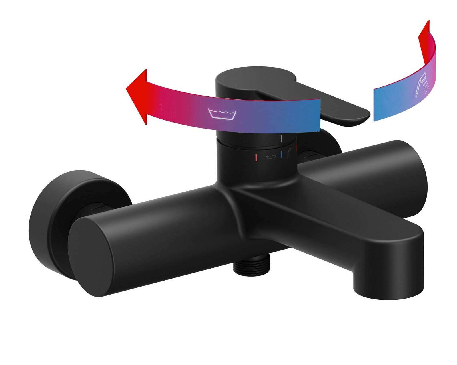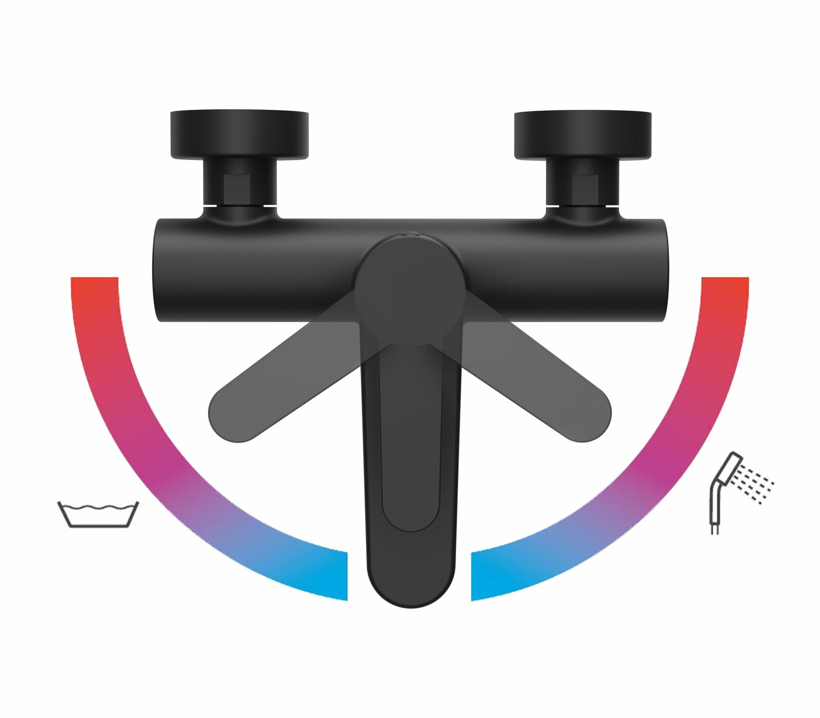 Nástěnná vanová baterie Puri se skrytým rotačním přepínačem, bez sprchového setu. V černém provedení. Perlátor s funkcí FlexiFlow.- rozteč baterie: 150 mm