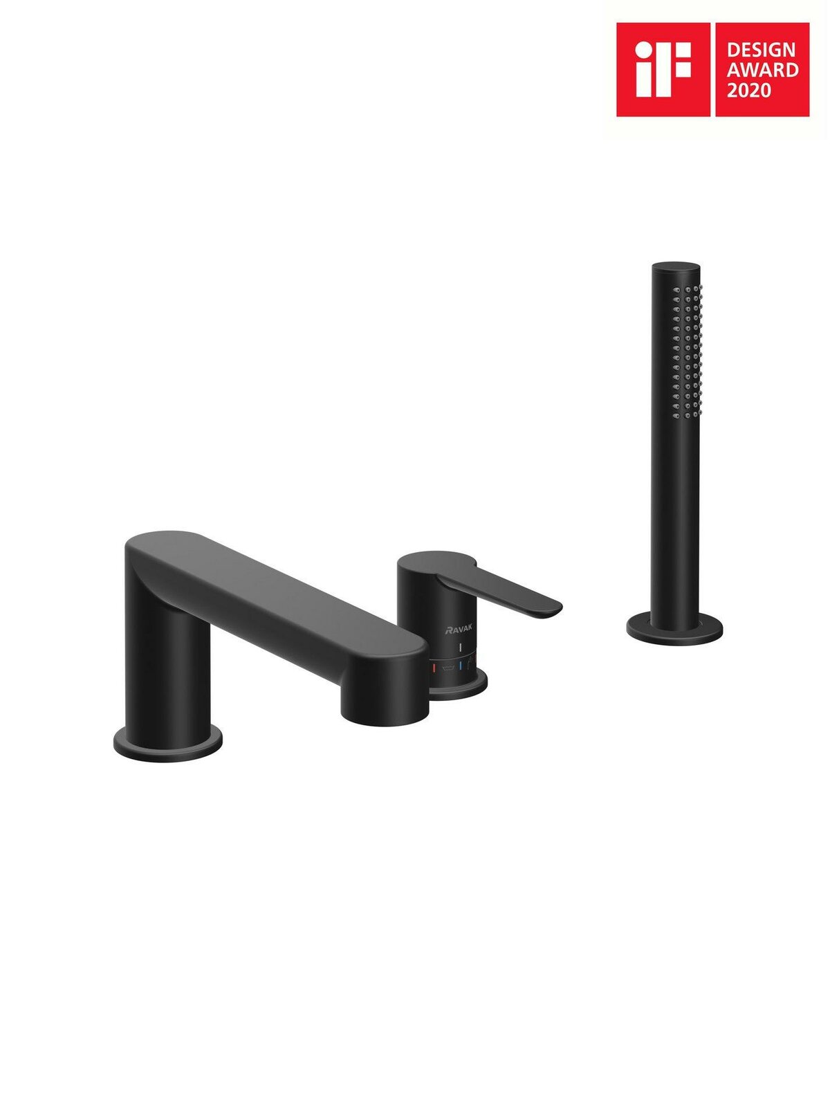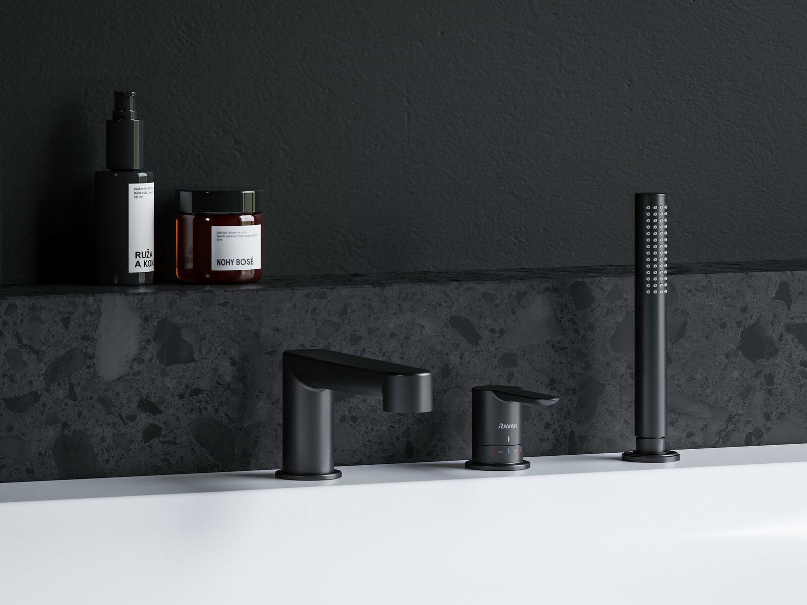 Vanová stojánková 3otvorová baterie Puri s rotačním přepínačem, se sprchovým setem. V černém provedení.- kartuš (průměr, materiál): 40 mm, keramická