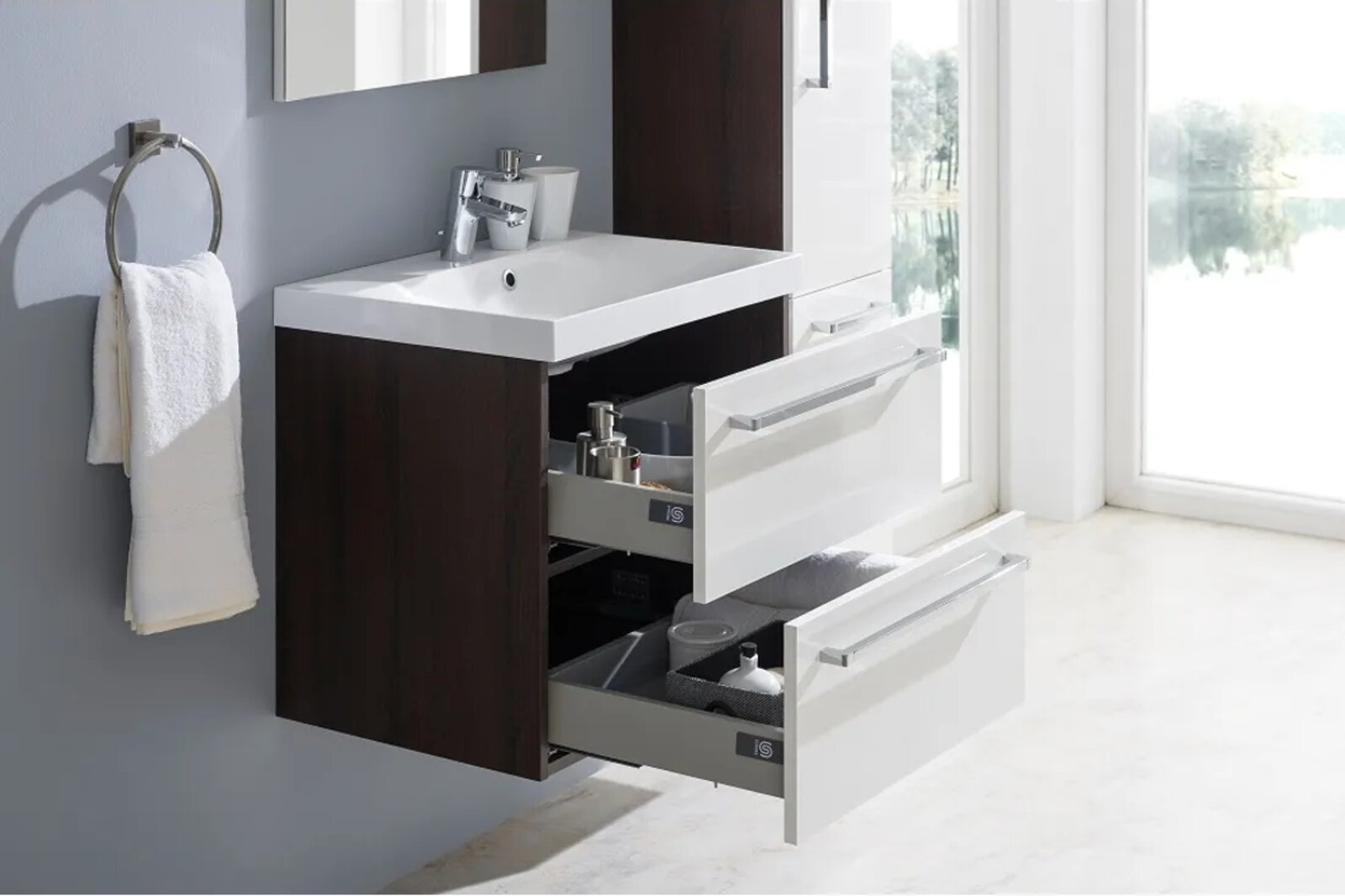Elegantní skříňky Pure ozdobí každou domácnost. Tato série působí příjemným dojmem, je jednoduchá a efektní. Kolekce je tím ozvláštněná, ale zároveň působí čistě a vzdušně. Tato závěsná skříňka se pyšní brzdou dovírání poskytující větší komfort. V horní zásuvce skříňky je vykrojení pro umyvadlový sifon. Skříňky jsou dodávané smontované. Materiál skříněk LDTD – touto zkratkou se označují laminované desky. ABS laserem opracované hrany, které zajišťují uzavření čelních ploch laminovaných deskových materiálů. Použito PUR lepidlo - tato lepidla patří k nejmodernějším lepidlům určeným pro obzvlášť vysoce zatěžované spoje. Vnitřní výška horního šuplíku je 22 cm a spodního šuplíku 20 cm. Včetně umyvadla z litého mramoru.