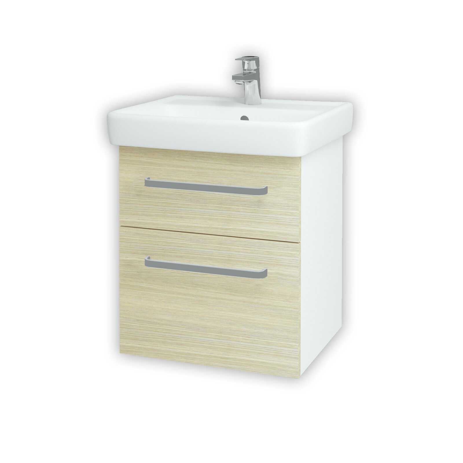 Svými rozměry se skříňka Q MAX SZZ2 55 hodí zejména do menších panelákových koupelen. Hlavní výhodou skříňky jsou ale dvě prostorné zásuvky, uložené na kvalitních výsuvech značky Hettich s jemným dovíráním a celoživotní zárukou. Do skříňky je zasazeno elegantní bílé keramické umyvadlo Q 55. Přední plocha zásuvek má ostré hrany.
