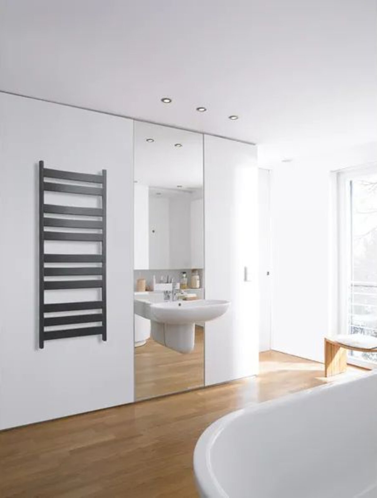 Vysoká elegance a jasné linie. Díky plochému designu vodorovných trubek přináší radiátor Zehnder Zeta do koupelny moderní vzhled a funkčnost. Velkorysý prostor mezi sadou vodorovných trubek a jejich větší vzdálenost od zdi pro snadné zavěšení a rychlejší sušení ručníků.