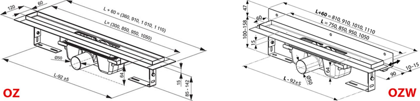 V případě kombinace sprchového koutu s odtokovým žlabem je nutné vycházet z rozměrů jednotlivých výrobků. Žlab o délce 75 cm je vhodný pro sprchové kouty s minimální šířkou 900 mm. Přesné rozměry sprchových koutů naleznete u jednotlivých výrobků v technickém listu.