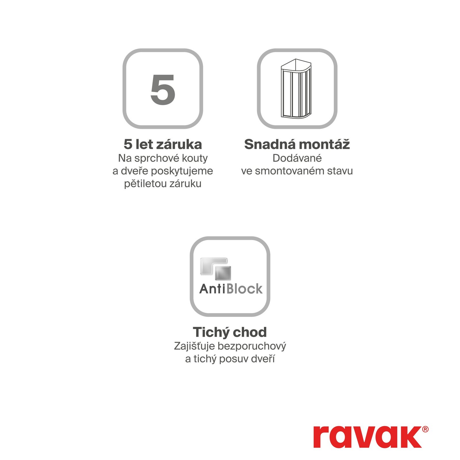 Výrobek tvoří dva pevné rovné díly a dva ohýbané díly jako posuvné dveře. Montuje se do obloženého rohu koupelny na vaničky Ravak Ronda, Elipso, Elipso Pro, Elipso Pro Chrome nebo přímo na podlahu se zabudovaným odtokovým žlabem či podlahovou vpustí.