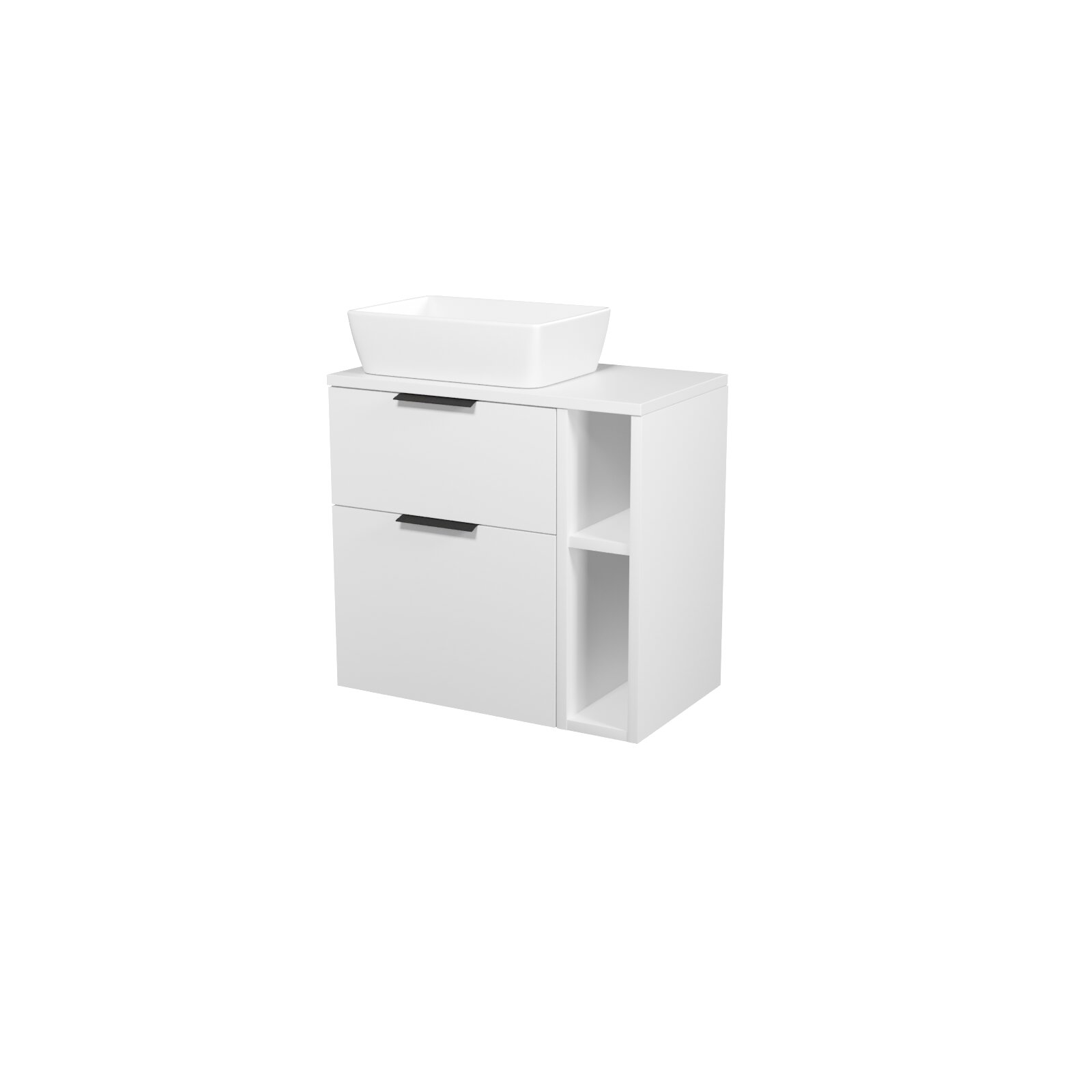 Skřííňka Cersanit City 60 pod desku bílá, skříňka 20 pod desku otevřená bílá, deska 80 horní bílá, umyvadlo City 60 na desku obdélníkové bílé, úchytky černé
