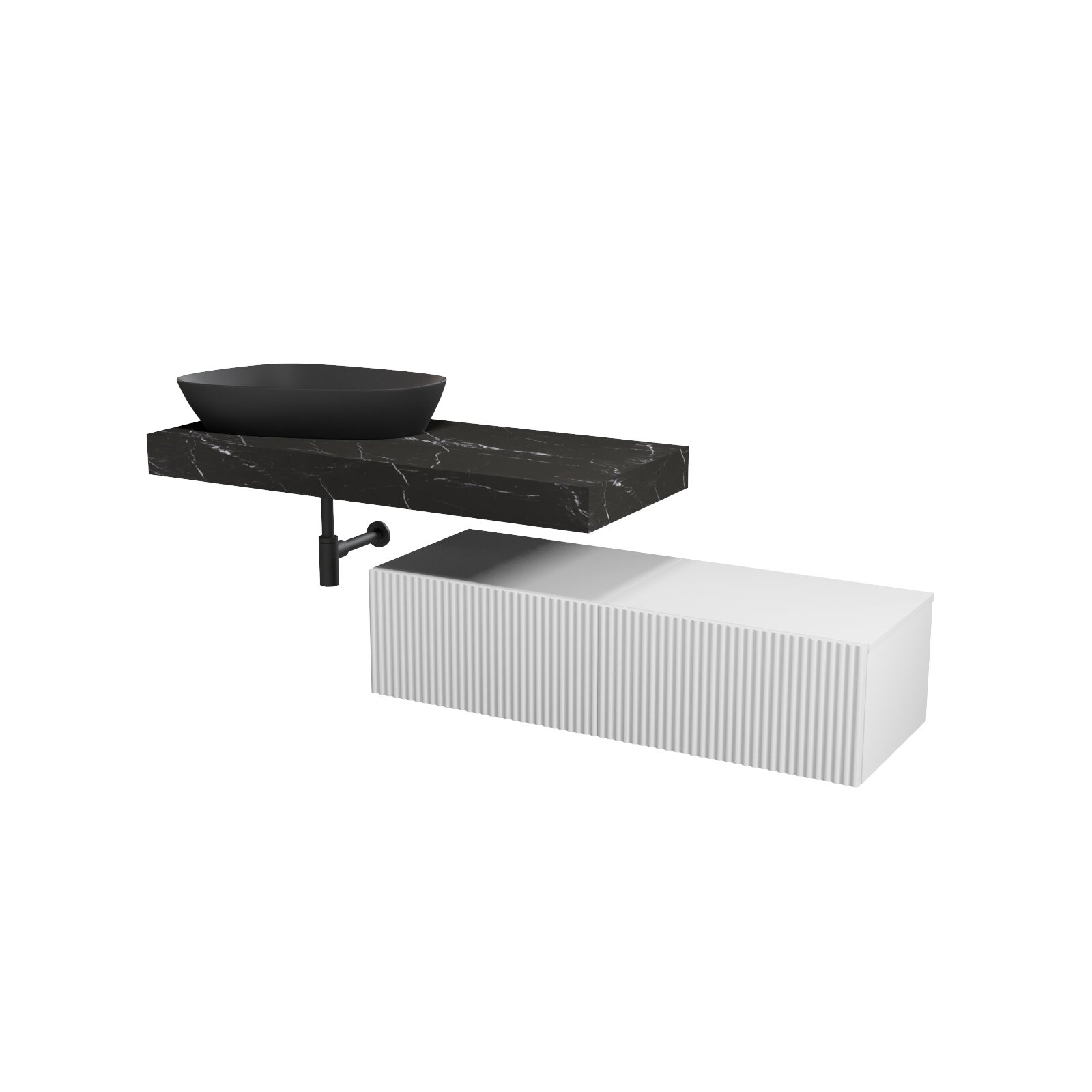 Skříňka Cersanit Kontra 60 pod desku bílá 2x, deska 120 nábytková bílá, deska 120 pod umyvadlo černý mramor, umyvadlo Kontra 60 na desku nepravidelné antracitové, sfion Inverto černý kulatý, výpust umyvadlová antracitová