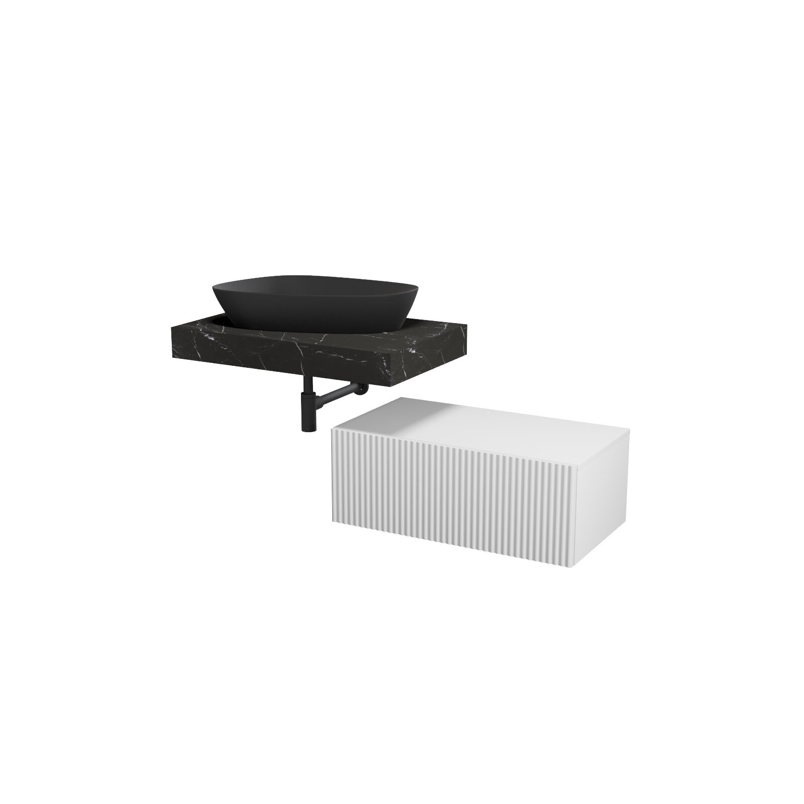 Skříňka Cersanit Kontra 80 pod desku bílá, deska 80 nábytková bílá, deska 80 pod umyvadlo černý mramor, umyvadlo Kontra 60 na desku nepravidelné antracitové, sfion Inverto černý kulatý, výpust umyvadlová antracitová