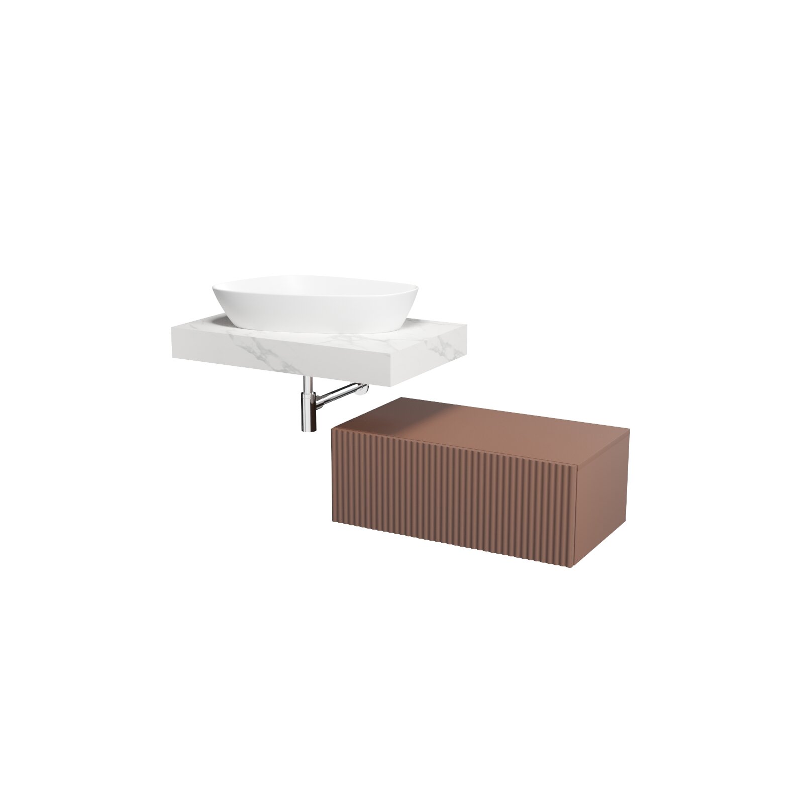 Skříňka Cersanit Kontra 80 pod desku marsala, deska 80 nábytková marsala, deska 80 pod umyvadlo bílý mramor, umyvadlo Kontra 60 na desku nepravidelné bílé matné, sfion Inverto chrom oválný, výpust umyvadlová bílá matná