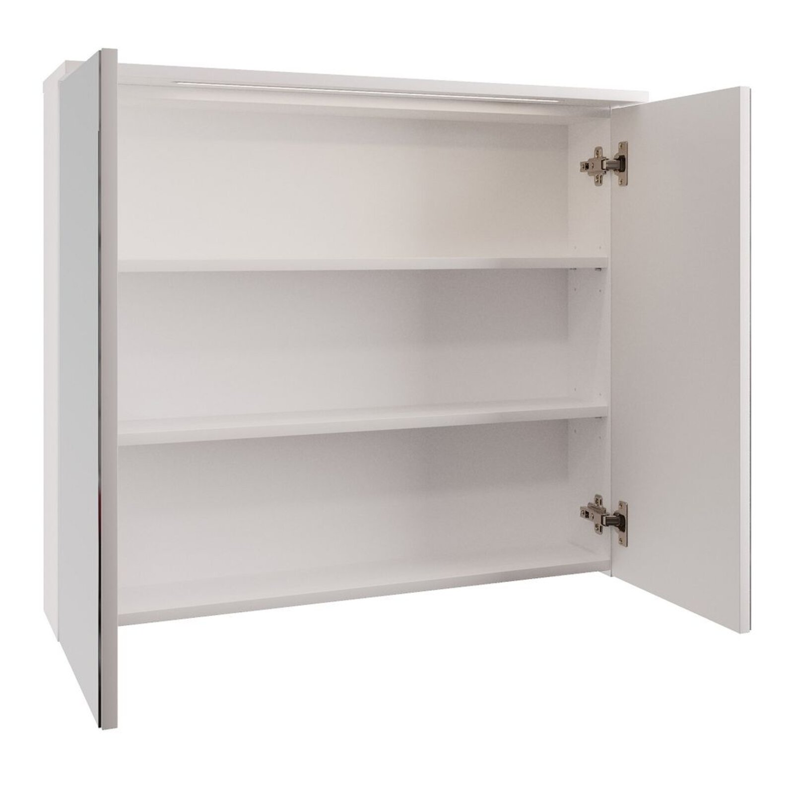 Bílá galerka s LED zabudovaným osvětlením, dvoukřídlá dvířka se zrcadlem, 2x nastavitelná bílá police. LED bodové světlo 230 V, teplota světla 4500 K, svítivost: 260 LM, krytí IP44, panty s tlumením a bílá záda do drážky, lamino - 16 mm, ABS 1 mm. Dodáváno ve smontovaném stavu, připraveno k okamžité instalaci. Galerku instalujte na rovnou stěnu. Nevystavujte nábytek trvalé vlhkosti a styku s vodou. Koupelnu vždy řádně odvětrejte. Při zkroucení korpusu skříňky může dojít k poruše funkce dovíracích mechanismů.