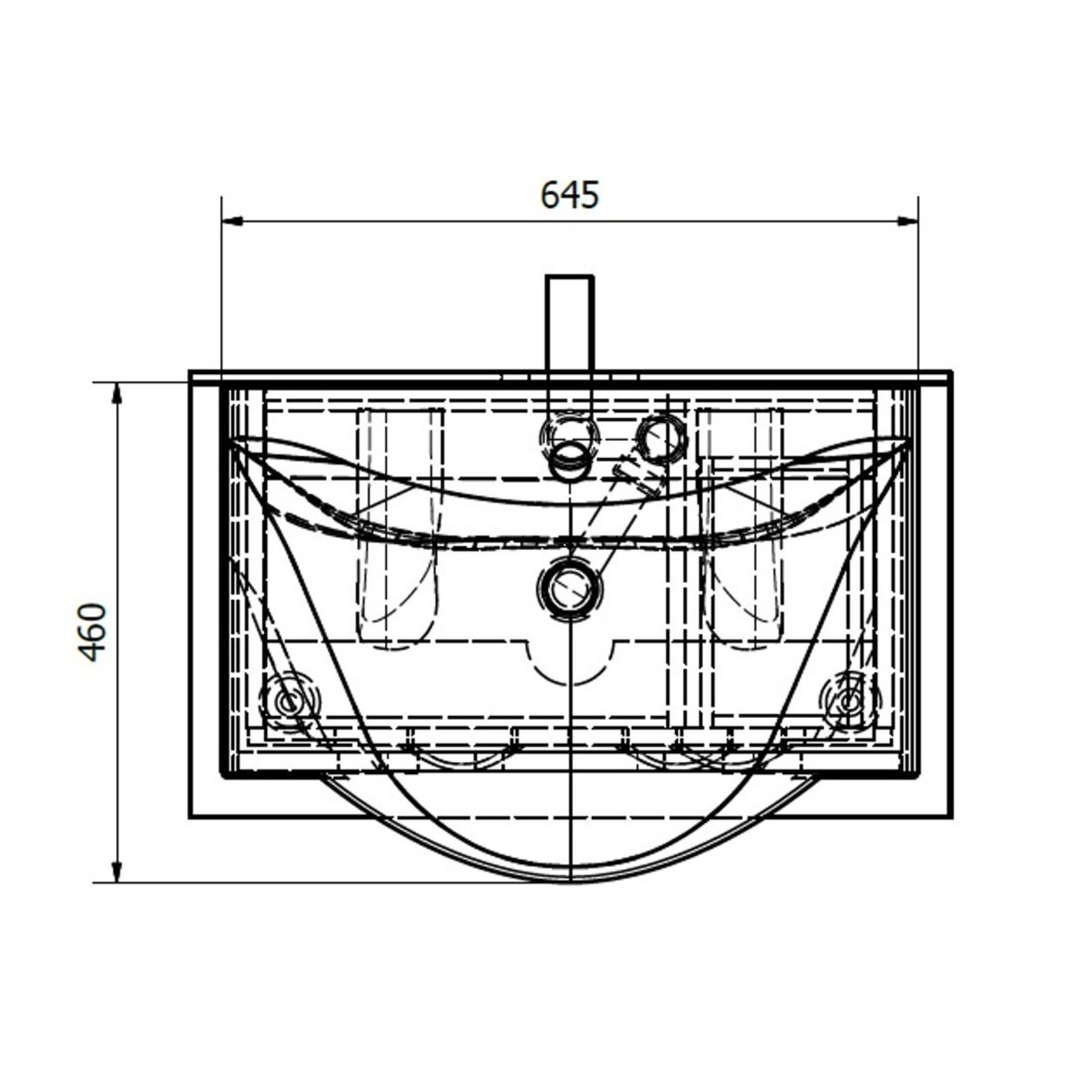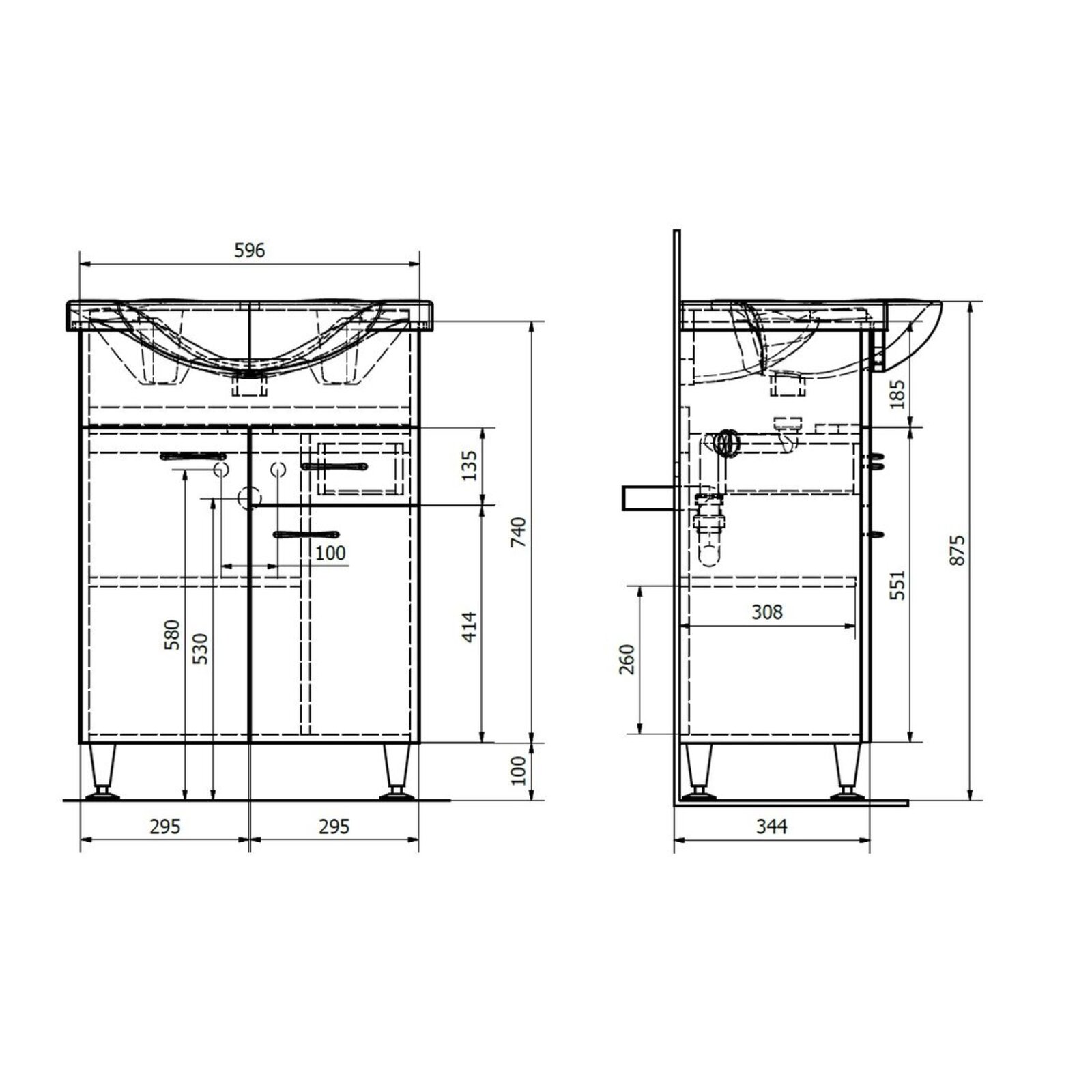 Rozměry jsou udávány včetně nožiček 10 cm a umyvadla. Skříňka bez umyvadla a nožiček má rozměr 59,6 x 74 x 31,8 cm (šířka x výška x hloubka). 4 kovové nožičky jsou v ceně a součástí balení.