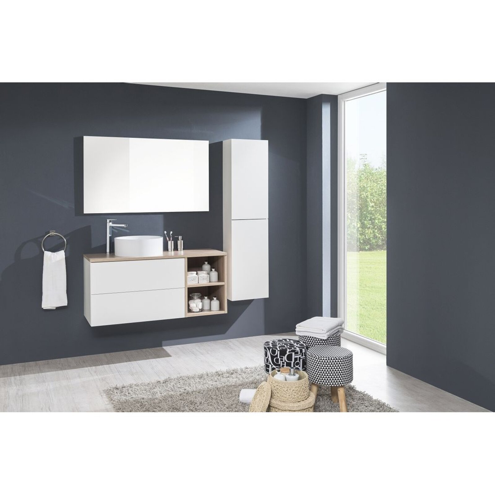 Kombinovatelné se skříňkou nebo umyvadlem stejné série, zásuvky jsou řešeny push-open otevíráním bez úchytek, zásuvky jsou opatřeny pomalým dovíráním. V horní zásuvce skříňky je vykrojení pro umyvadlový sifon. Dodáváno ve smontovaném stavu. Vnitřní výška horního šuplíku je 14,5 cm a spodního šuplíku 20 cm. Skříňky mají nadstandardní pojezdy Blum, které je možné seřídit ve všech směrech.