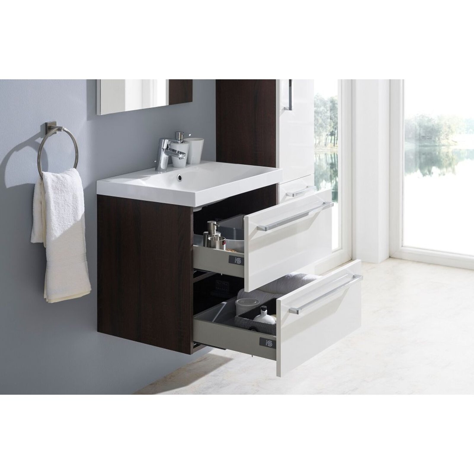 Elegantní skříňky Pure ozdobí každou domácnost. Tato série působí příjemným dojmem, je jednoduchá a efektní. Kolekce je tím ozvláštněná, ale zároveň působí čistě a vzdušně. Tato závěsná skříňka se pyšní brzdou dovírání poskytující větší komfort. V horní zásuvce skříňky je vykrojení pro umyvadlový sifon. Skříňky jsou dodávané smontované. Skříňka má zpomalené dovírání. Materiál skříněk LDTD – touto zkratkou se označují laminované desky. ABS laserem opracované hrany, které zajišťují uzavření čelních ploch laminovaných deskových materiálů. Použito PUR lepidlo - tato lepidla patří k nejmodernějším lepidlům určeným pro obzvlášť vysoce zatěžované spoje. Vnitřní výška horního šuplíku je 22 cm a spodního šuplíku 20 cm. Včetně umyvadla z litého mramoru.