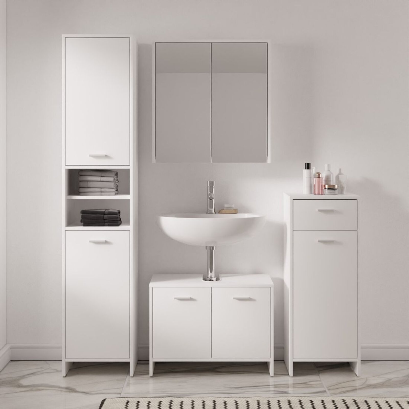 Materiál: lamino - tloušťka 16 mm, s melaminovou hranou a plastovou úchytkou. 2 dvířka, tlumení zavření nalepovací silikonovou čočkou. Jemné a decentní skříňky ze série Sofie nabízí k výběru 2 odstíny: bílá a dub sonoma. Skříňky jsou dodávané nesmontované (demont), pro snazší transport. Unikátní skříňka s výřezem pro umyvadlový sifon Vám nabízí jedinečnou možnost kombinace s umyvadly různých tvarů a rozměrů a dodá Vaší koupelně elegantní a vzdušný vzhled.