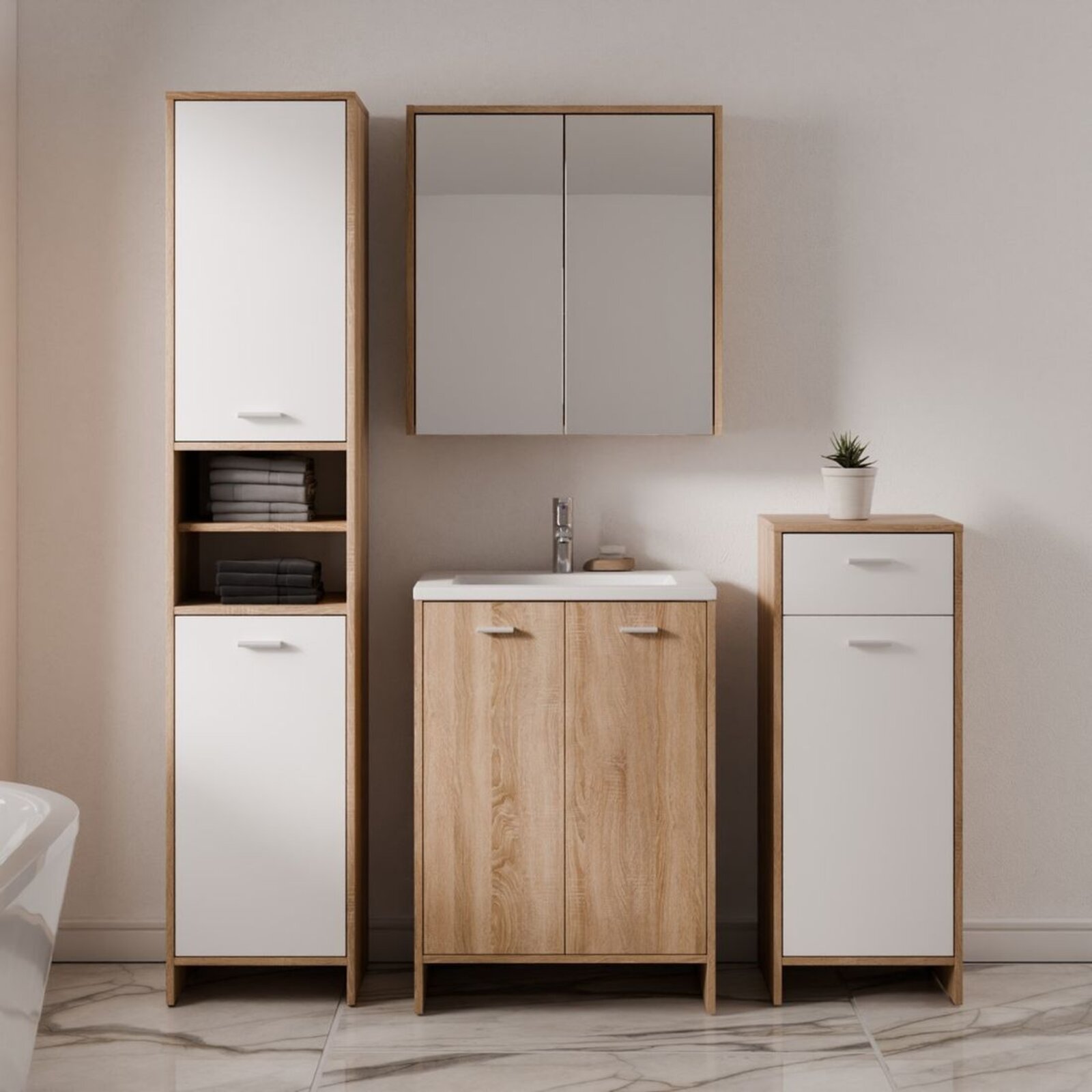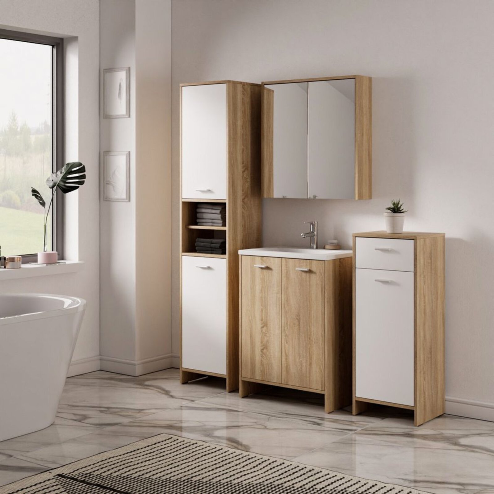 Materiál: lamino - tloušťka 16 mm, s melaminovou hranou a plastovou úchytkou. 2 dvířka, tlumení zavření nalepovací silikonovou čočkou. Jemné a decentní skříňky ze série Sofie nabízí k výběru 2 odstíny: bílá a dub sonoma. Skříňky jsou dodávané nesmontované (demont), pro snazší transport. Unikátní skříňka s výřezem pro umyvadlový sifon Vám nabízí jedinečnou možnost kombinace s umyvadly různých tvarů a rozměrů a dodá Vaší koupelně elegantní a vzdušný vzhled.