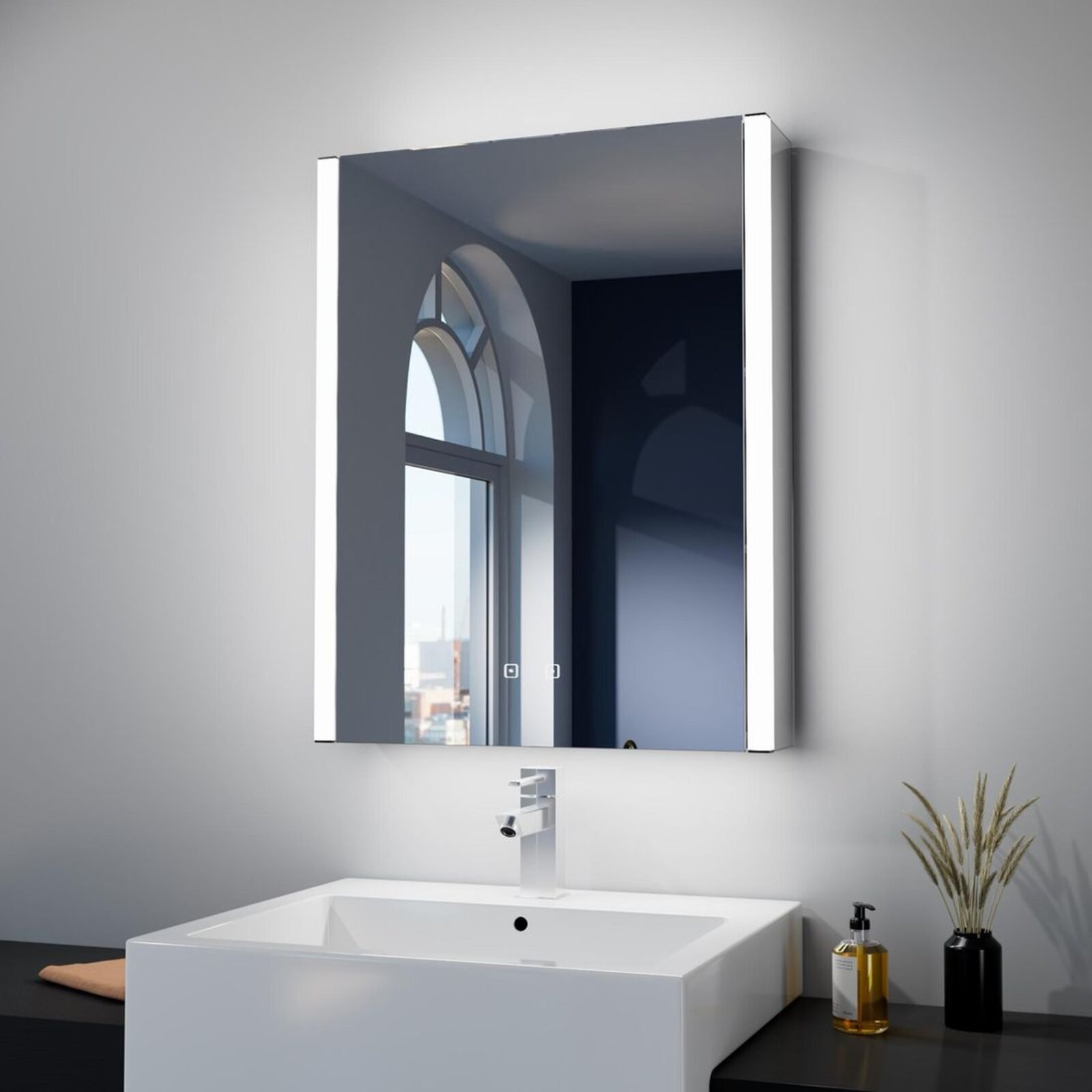 Pomalé dovírání není jedinou praktickou funkcí, kterou zrcadlová skříňka kielle Arkas I nabízí. Součástí skříňky je i dotykový vypínač, kterým nastavujete požadovanou teplotu světla. Ovládáte jím také funkci stmívání. Potěší také funkce paměti, jež nastaví poslední zadané hodnoty. V neposlední řadě jistě přivítáte funkci odmlžování, jež vám umožní zrcadlo bez potíží použít kdykoli, a to i po dlouhé koupeli či sprchování, kdy bývá místnost zamlžena a zrcadlo bývá třeba opakovaně otírat.