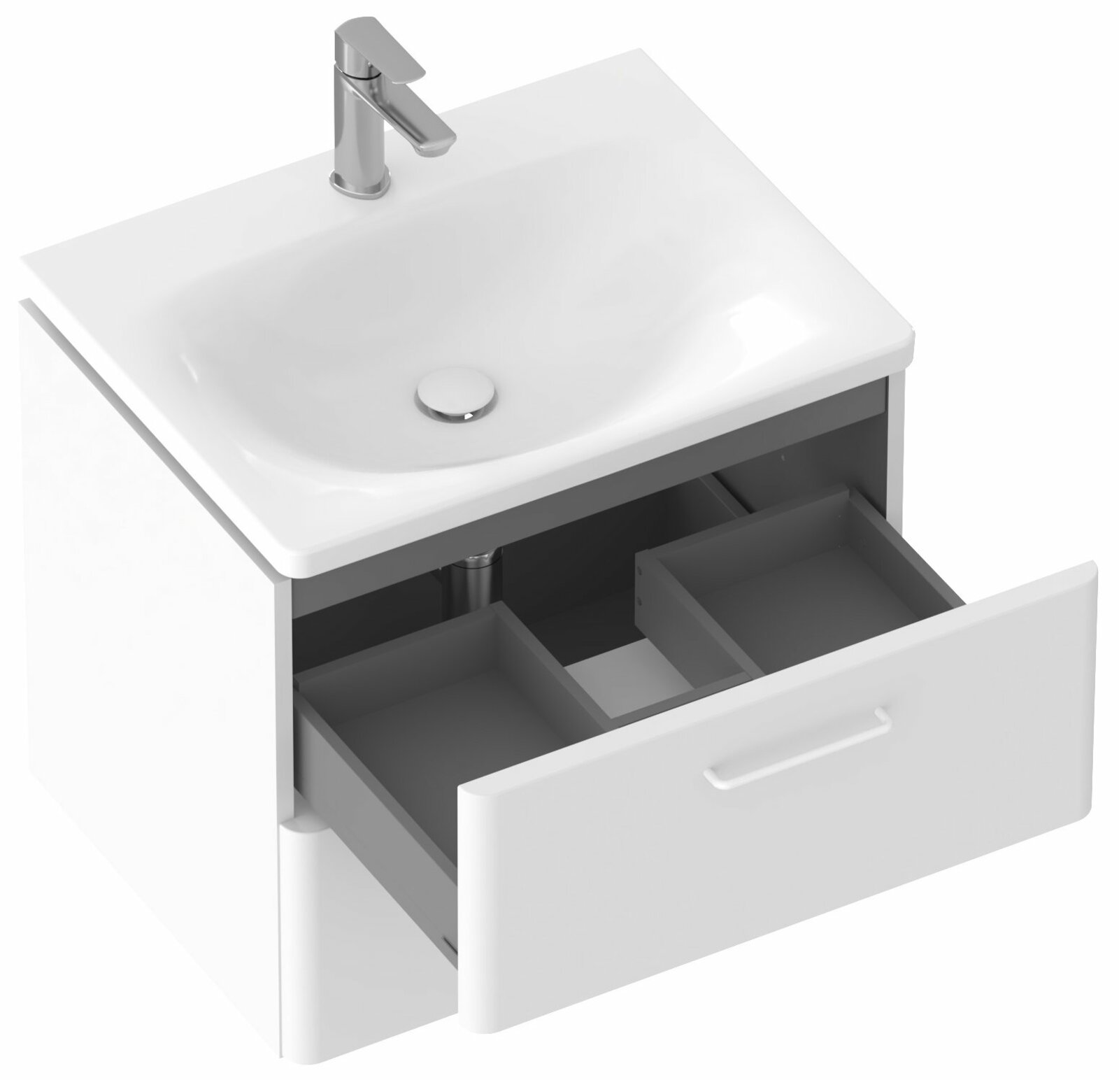 Vnitřní prostor skříňky je v barvě grafit. Dvě praktické zásuvky s pomalým dojezdem nabízí dostatek úložného prostoru. Skříňka má předvrtané otvory pro madla, která nejsou součástí skříňky a je nutné je dokoupit zvlášť ve 2 kusech. Na výběr jsou ve třech barevných provedeních - lesklý chrom, černá nebo bílá. Je určena pod zápustné umyvadlo Balance 60 bez přepadu, doplněné umyvadlovým sifonem s pevnou výpustí. Skříňku lze doplnit také bílou deskou Balance 60 a umyvadlem na desku nebo deskou Balance 120, konzolí desky Balance/Comfort 120, bílým věšákem ručníků Balance II a umyvadlem na desku (např. řady Uni / Uni Slim). Dvě skříňky vedle sebe lze doplnit deskou Balance 120 a získat tak velkorysý úložný prostor i odkládací plochy.