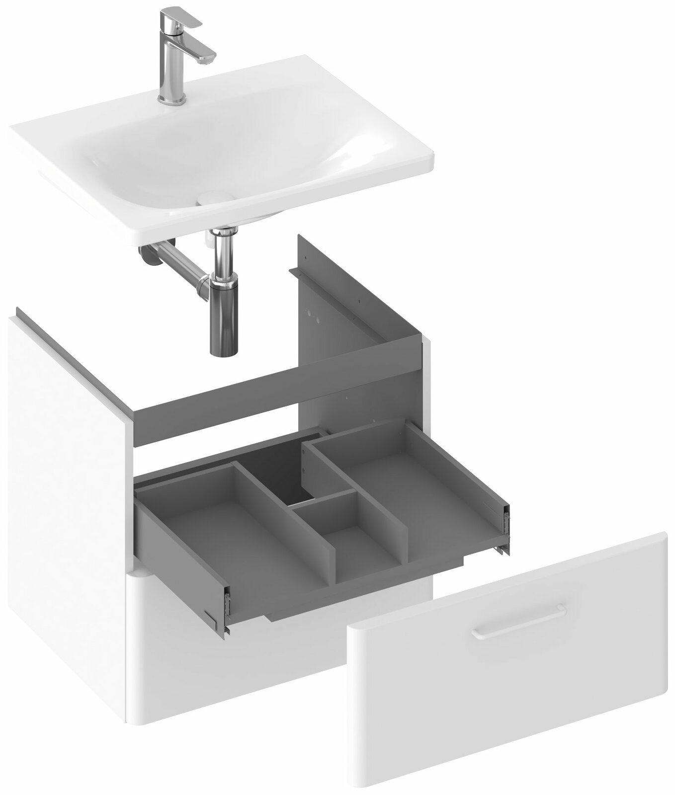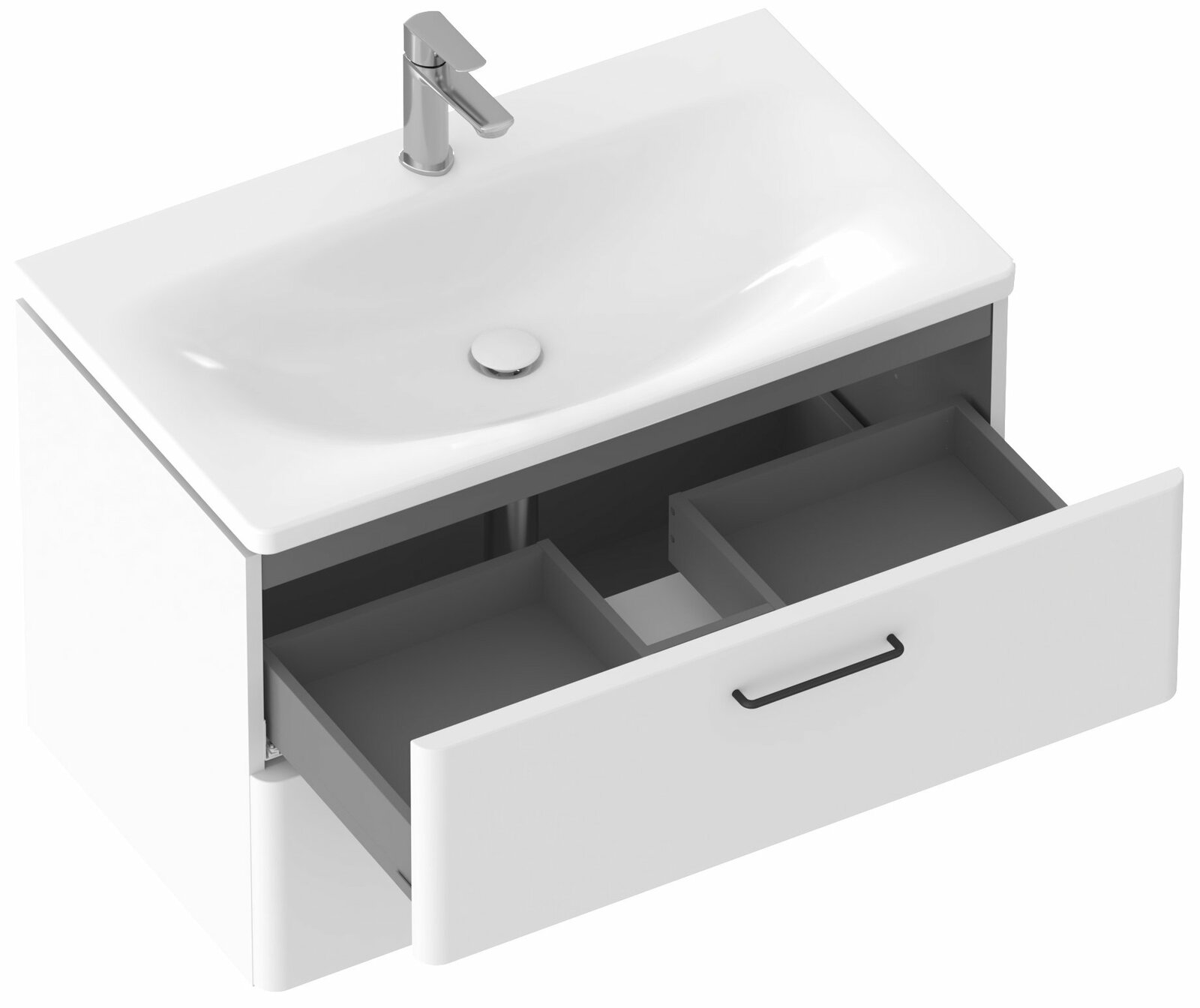 Vnitřní prostor skříňky je v barvě grafit. Dvě praktické zásuvky s pomalým dojezdem nabízí dostatek úložného prostoru. Skříňka má předvrtané otvory pro madla, která nejsou součástí skříňky a je nutné je dokoupit zvlášť ve 2 kusech. Na výběr jsou ve třech barevných provedeních - lesklý chrom, černá nebo bílá. Je určena pod zápustné umyvadlo Balance 80 bez přepadu, doplněné umyvadlovým sifonem s pevnou výpustí. Skříňku lze doplnit také bílou deskou Balance 80 a umyvadlem na desku (např. řady Uni / Uni Slim).