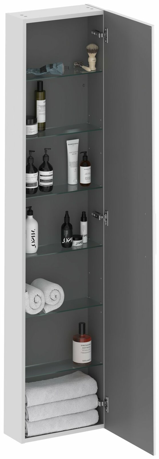 Vysoká skříňka SB Balance II 40 s šesti kouřovými skleněnými poličkami. Vnitřní prostor skříňky je v barvě grafit. Skříňka má předvrtaný otvor pro madlo, které není součástí skříňky a je nutné jej dokoupit zvlášť. Na výběr je ve třech barevných provedeních - lesklý chrom, černá nebo bílá.
