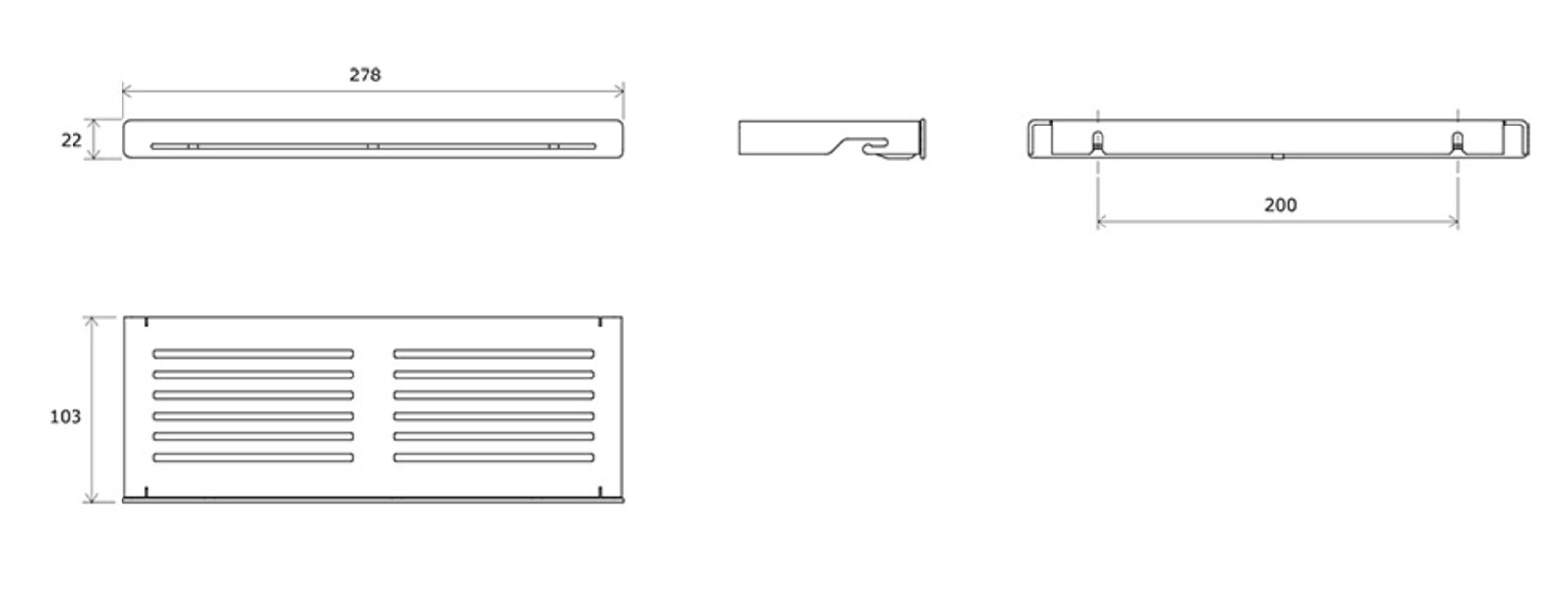 Rovná plocha poličky je perforovaná tak, aby se voda nedržela na povrchu, přesto však poskytuje stabilitu umístěným předmětům. Po stranách poličky se nachází praktické háčky k zavěšení žínky. Uprostřed poličky je uchycen spodní háček, který udrží i těžší předmět jako je například fén. Kombinací dvou a více kusů poliček docílíte efektní sestavy s extra odkládací plochou. Doporučujeme kombinovat s rohovou poličkou Slim C.