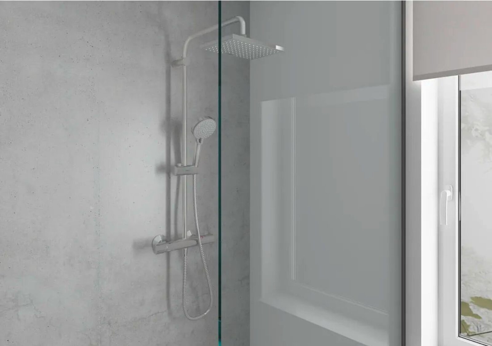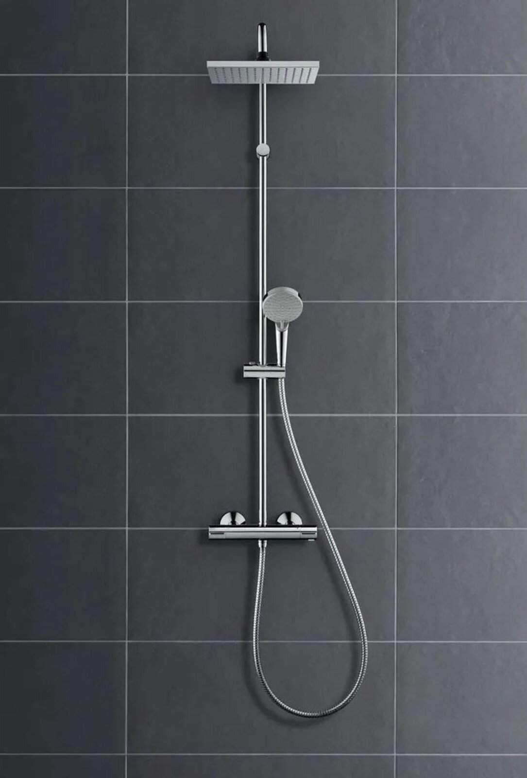 Obsahuje: horní sprcha, ruční sprcha, sprchový termostat, sprchová hadice, jezdec. Horní sprcha Vernis Shape 230 1jet, velikost sprchové hlavice horní sprchy: 230 x 170 mm, druh proudu horní sprchy: Rain, kulový kloub: nastavitelný úhel horní sprchy, druh proudu ruční sprchy: Rain, IntenseRain. Maximální průtok při 0,3 MPa: 15,2 l/min, průtok přívodem k ruční sprše (při 0,3 MPa): 15,2 l/min, průtok při proudu Rain (při 0,3 MPa): 12,4 l/min, min. průtokový tlak: 0,1 MPa, minimální provozní tlak: 0,1 MPa, maximální provozní tlak: 1,0 MPa. Průměr tyče: 19 mm, výškově nastavitelný držák ruční sprchy s jezdcem Push s aretací tlačítkem, délka sprchového ramena horní sprchy: 426 mm, termostat Vernis, bezpečnostní pojistka při 40°C, nastavitelné omezení teplé vody, ovládání spotřebičů otočením rukojeti, vhodné pro průtokový ohřívač s výkonem, způsob montáže: instalace na stěnu, rozměr přívodů DN15, závit přívodu G 1, zpětný ventil, počet spotřebičů: 2. Součást dodávky: showerpipe s termostatem, rozety, etážky, upevňovací materiál, montážní návod.