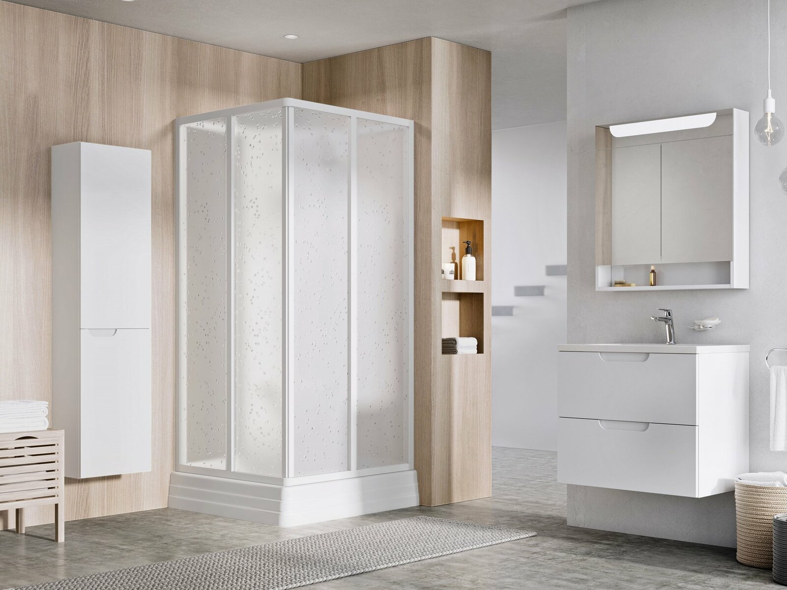 Čtyřdílný rohový sprchový box Supernova v bílém provedení a s výplní z neprůhledného plastu s dekorem Pearl. Posuvný systém otevírání. Včetně vybavení.- v rozměrech 90x90 cm