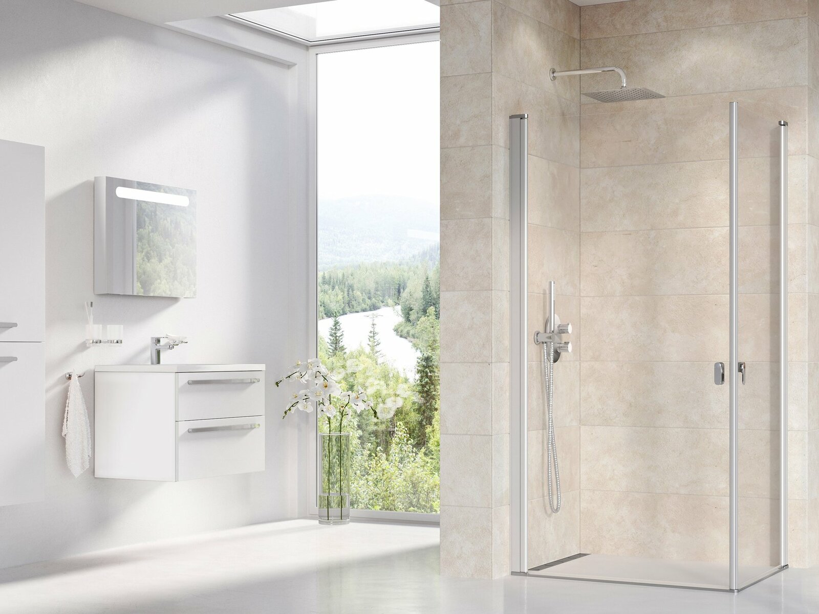 Rohový sprchový kout Chrome v provedení matný chrom a s výplní z čirého skla s ochrannou vrstvou Ravak AntiCalc®. Výrobek je složen ze sprchových dveří a pevné stěny. Pantový systém otevírání. Otočitelný výrobek pro levou i pravou variantu.