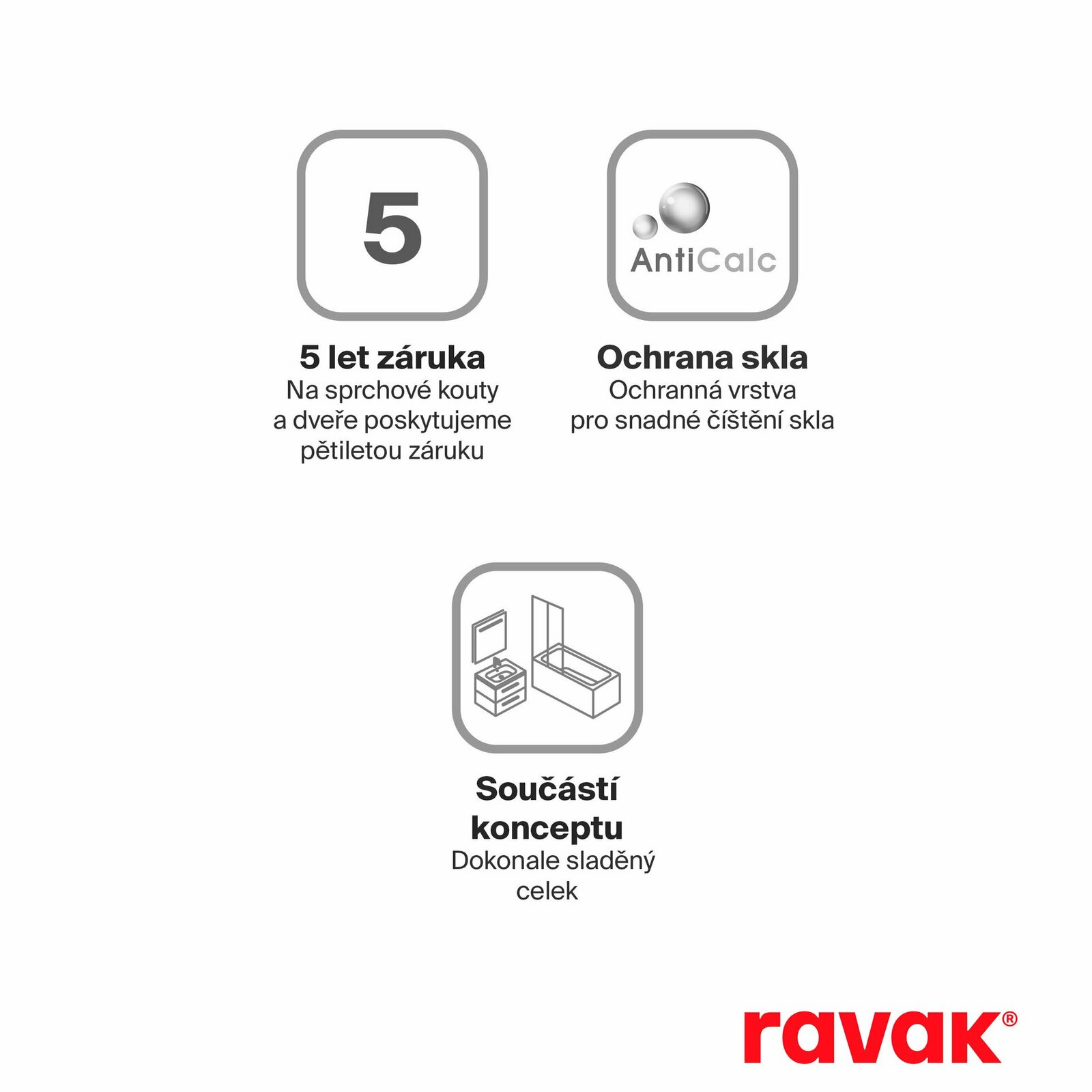 Výrobek se montuje do obloženého rohu koupelny na lité vaničky Ravak nebo přímo na podlahu se zabudovaným odtokovým žlabem či podlahovou vpustí.