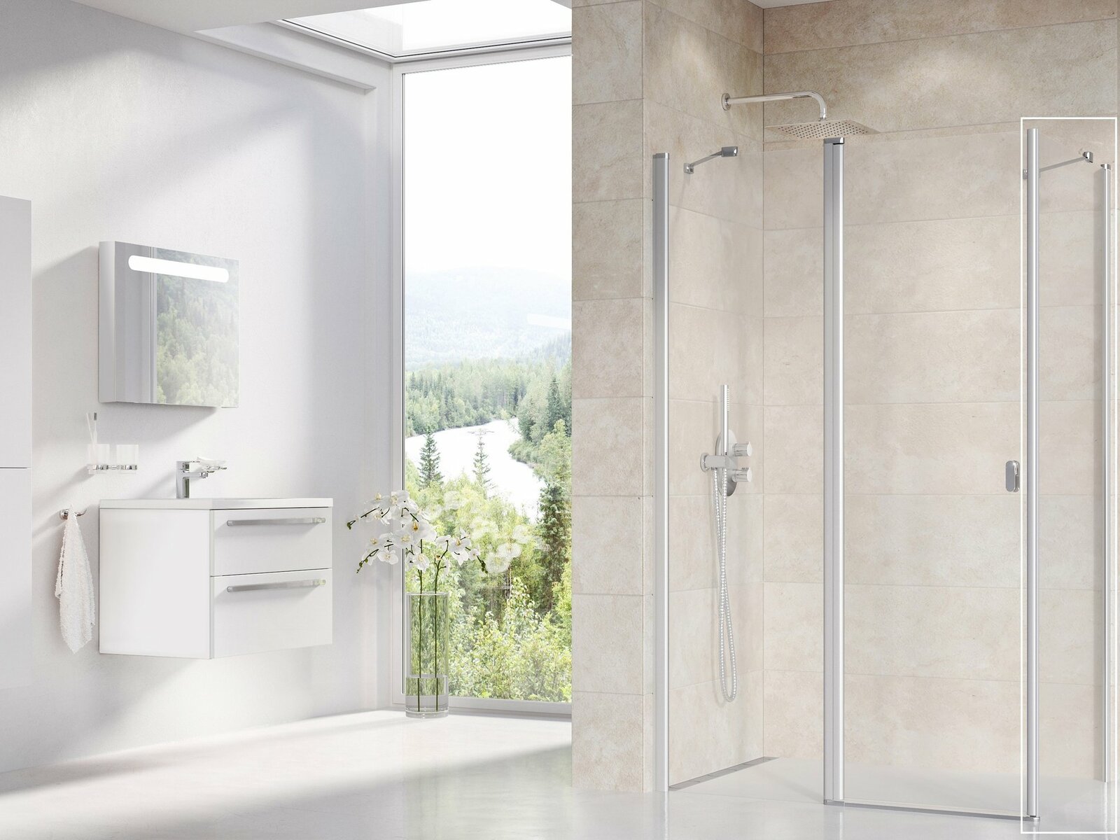 Rohový sprchový kout Chrome v provedení matný chrom a s výplní z čirého skla s ochrannou vrstvou Ravak AntiCalc®. Výrobek je složen ze sprchových dveří a pevné stěny. Pantový systém otevírání pouze ven do prostoru. Otočitelný výrobek pro levou i pravou variantu.