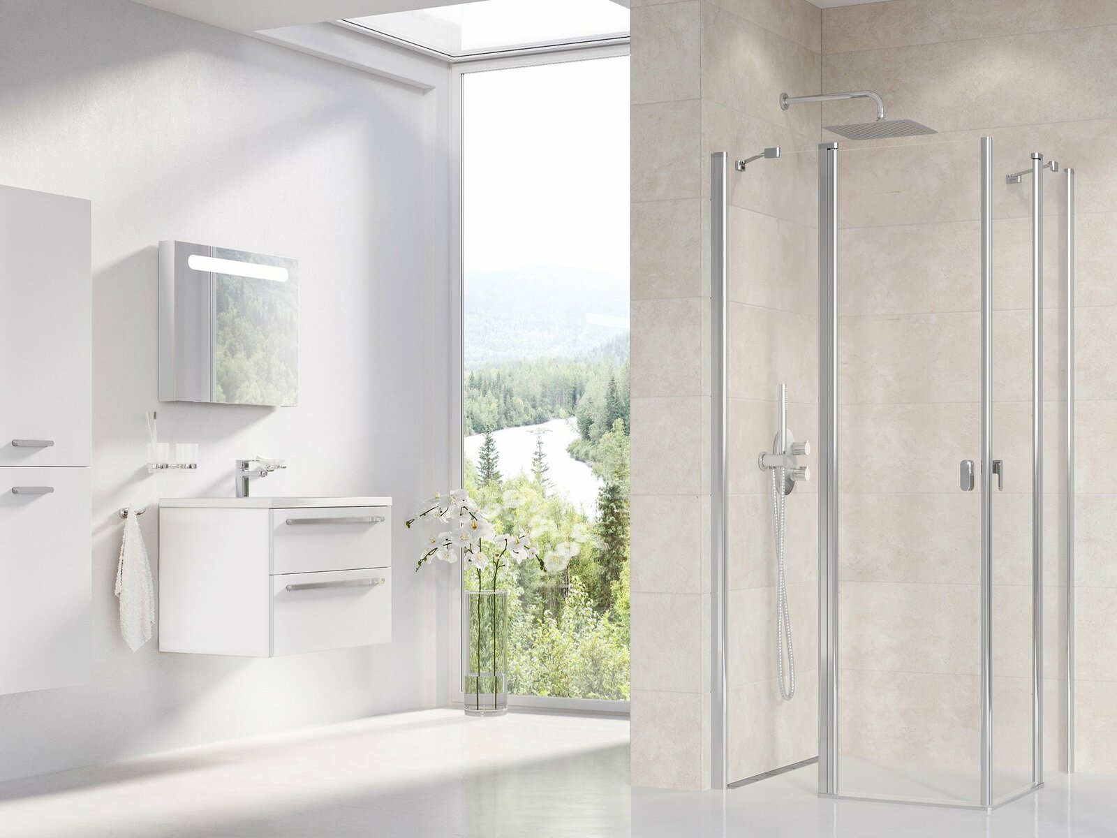 Rohový sprchový kout Chrome v provedení lesklý chrom a s výplní z čirého skla s ochrannou vrstvou Ravak AntiCalc®. Výrobek je složen ze dvou sprchových dveří. Pantový systém otevírání.