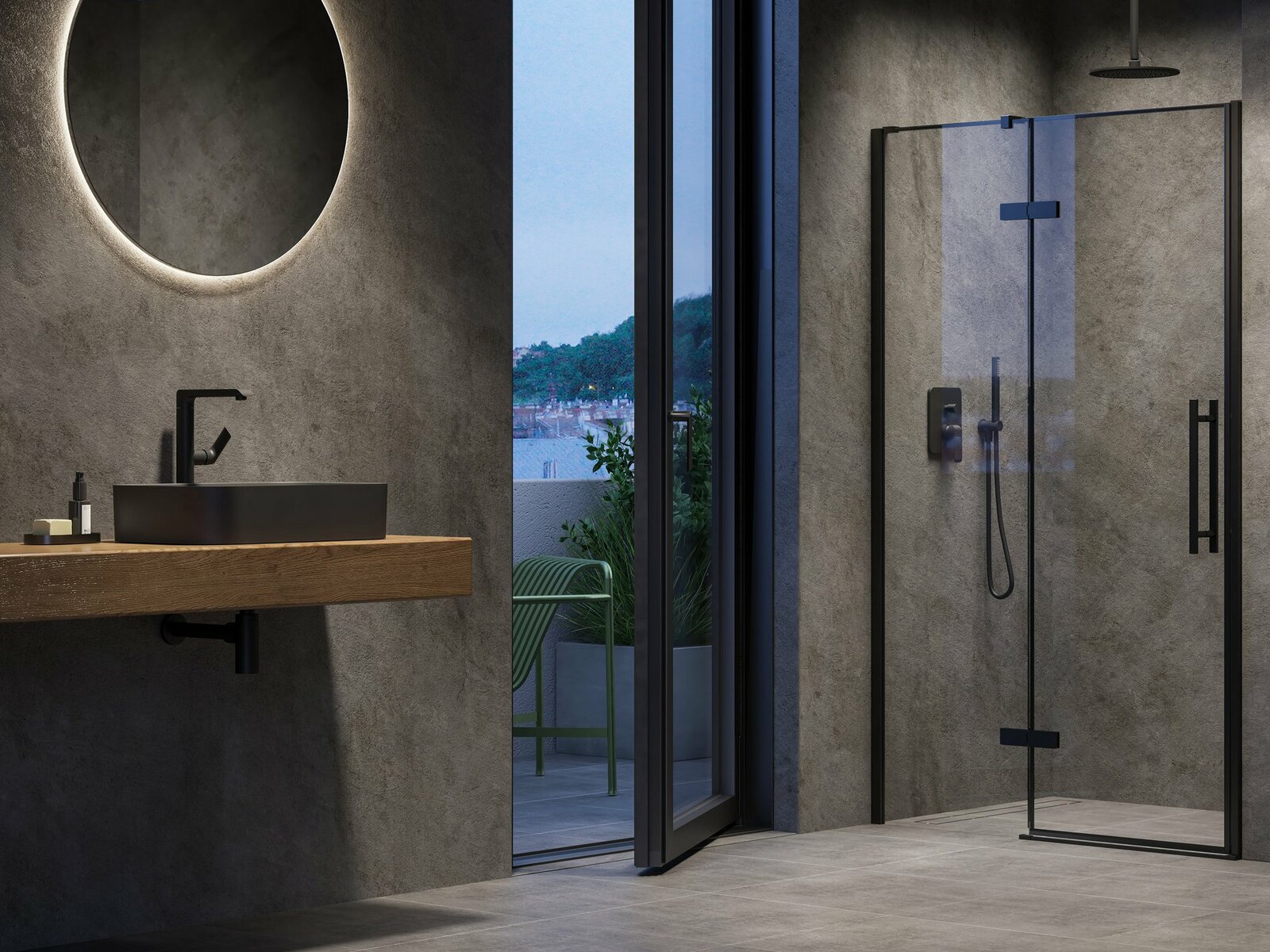 Rohový sprchový kout Cool! v černém provedení a s výplní z čirého skla s ochrannou vrstvou Ravak AntiCalc®. Pantový systém otevírání. Výrobek je složen ze sprchových dveří a pevné stěny. Otočitelný výrobek pro levou i pravou variantu.