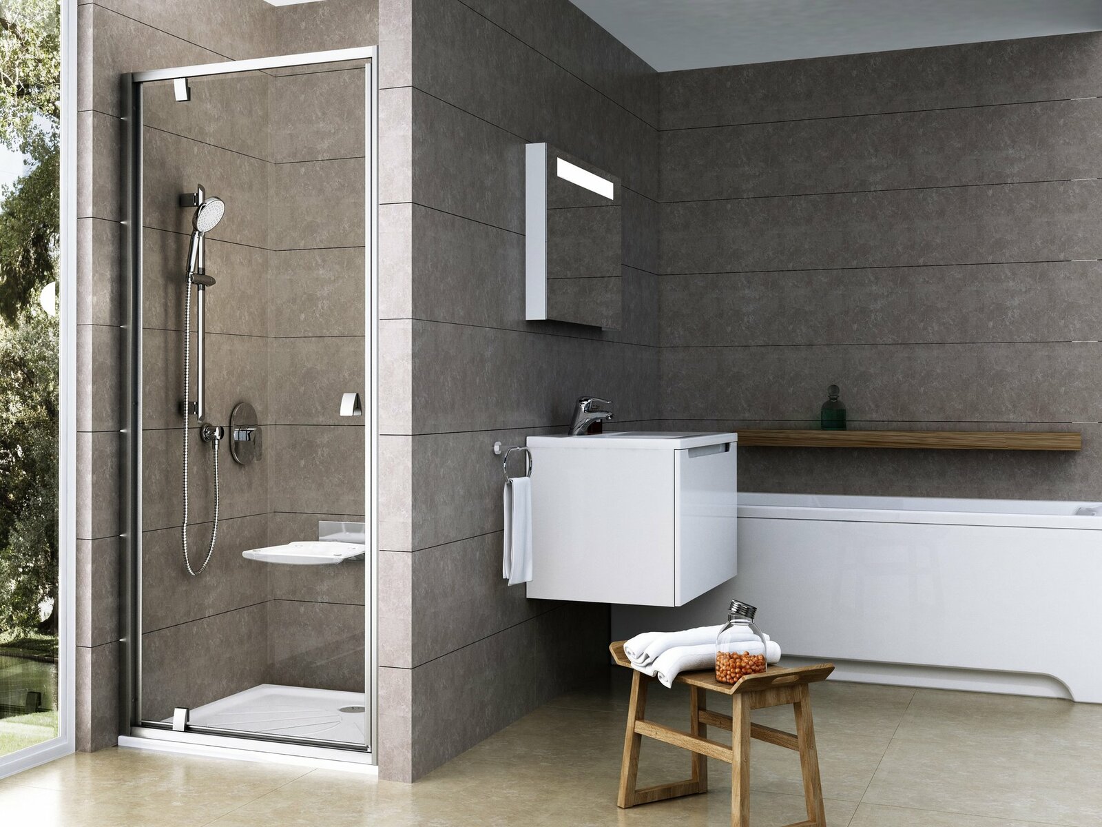 Výrobek se skládá z jednoho rovného otočného dílu, který tvoří dveře. Otočením výrobku o 180° získáte levou nebo pravou variantu otevírání dveří. Montuje se do obloženého rohu koupelny (ideálně do vyzděné niky nebo v kombinaci s pevnou stěnou PPS) na vaničky Ravak Aneta, Angela, Perseus, Perseus Pro, Perseus Pro Flat, Perseus Pro Chrome, Gigant Pro, Gigant Pro Flat, Gigant Pro Chrome nebo přímo na podlahu se zabudovaným odtokovým žlabem či podlahovou vpustí. Kombinací se dvěma pevnými stěnami typu PPS vytvoříte sprchový kout ve tvaru „U“. Použitím nastavovacího profilu PNPS lze výrobky rozšířit o 20 mm, proto se dokonale přizpůsobí stavebním nerovnostem až o 4 cm na každé straně.