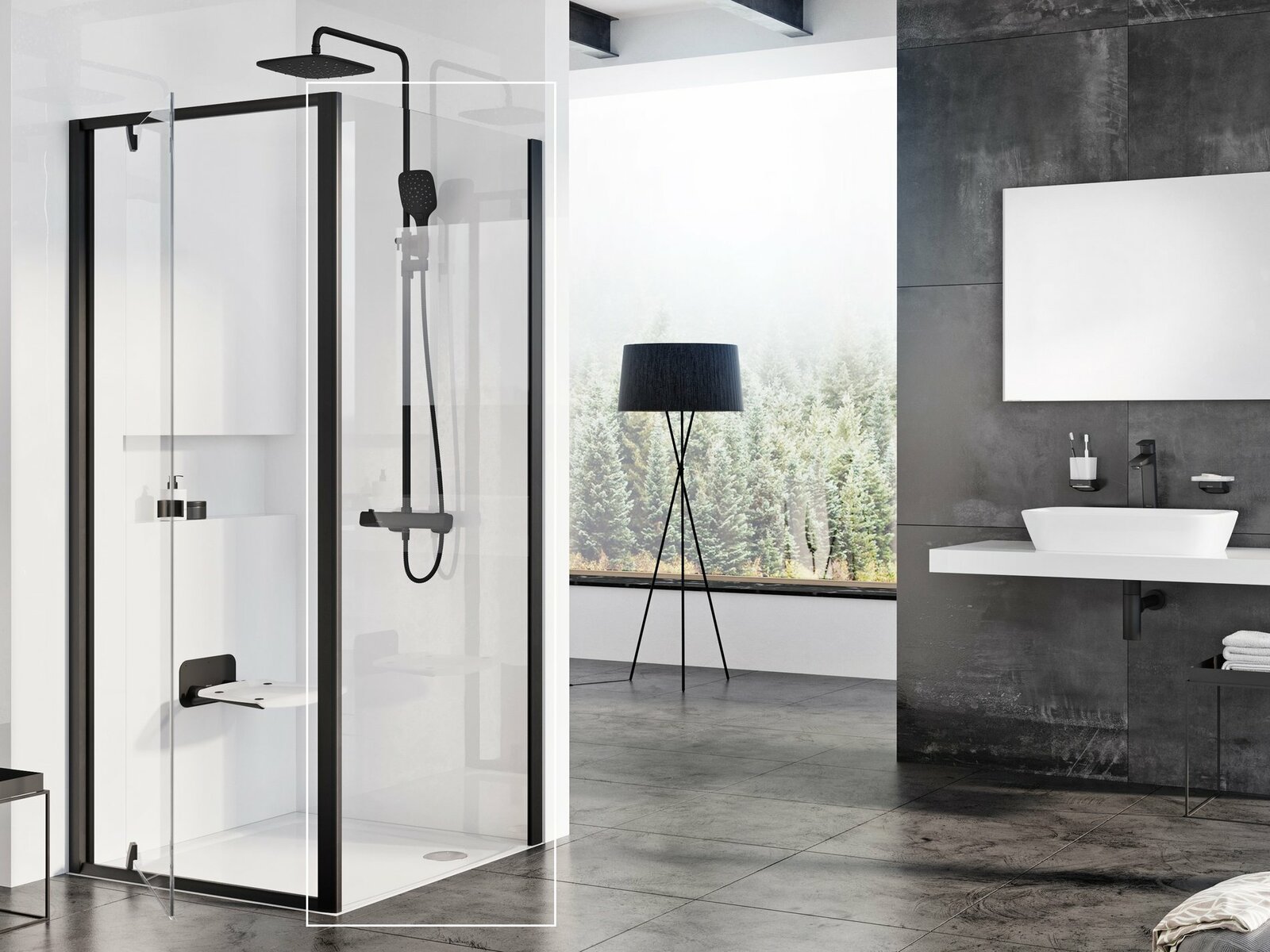 Rohový sprchový kout Pivot v černém provedení a s výplní z čirého skla s ochrannou vrstvou Ravak AntiCalc®. Otočný pivotový systém otevírání. Výrobek je složen ze sprchových dveří a pevné stěny. Otočitelný výrobek pro levou i pravou variantu.