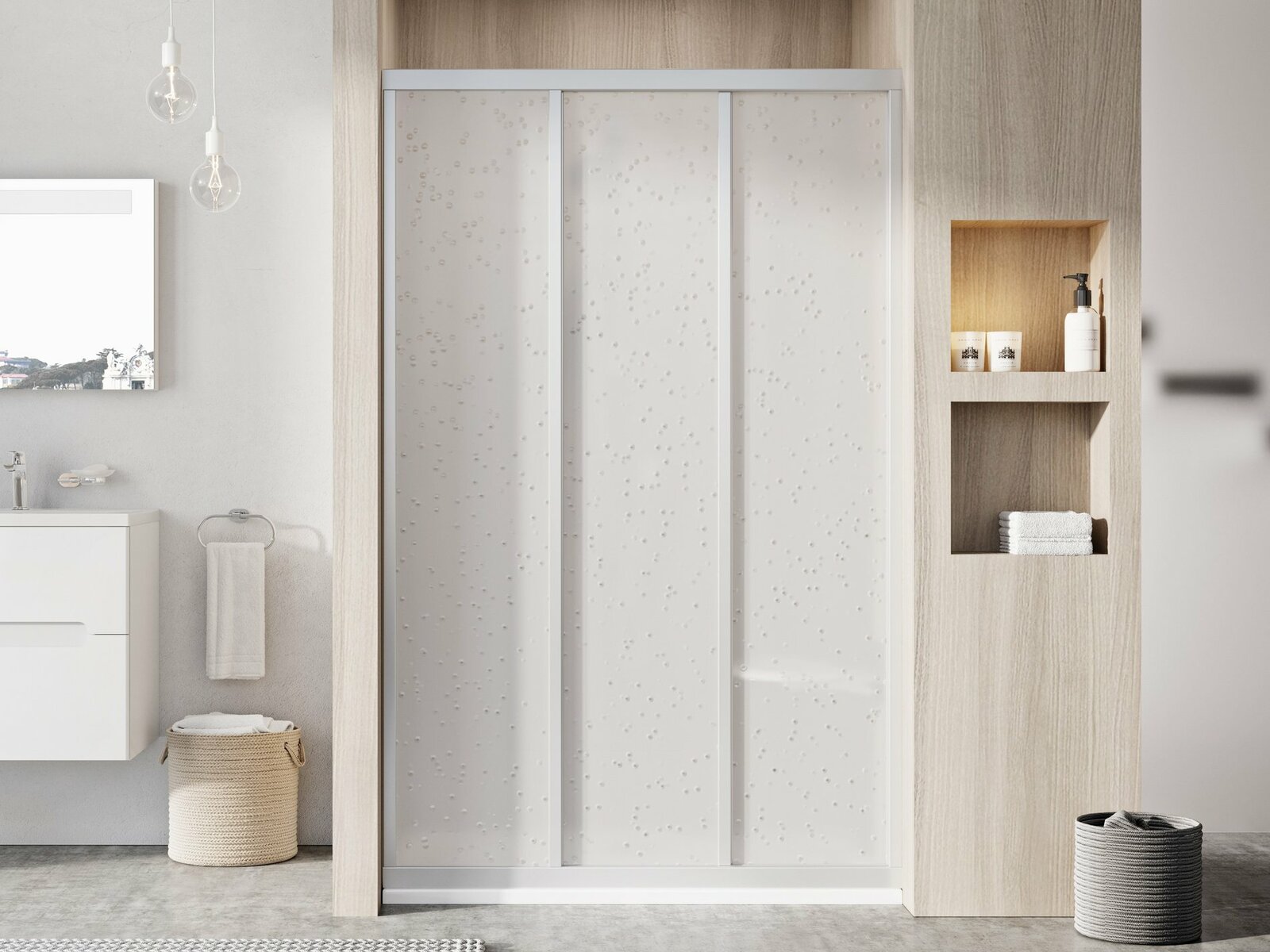 Rohový sprchový kout Supernova v provedení matný chrom a s výplní z umělé hmoty s dekorem Pearl. Posuvný systém otevírání. Výrobek je složen ze sprchových dveří a pevné stěny.