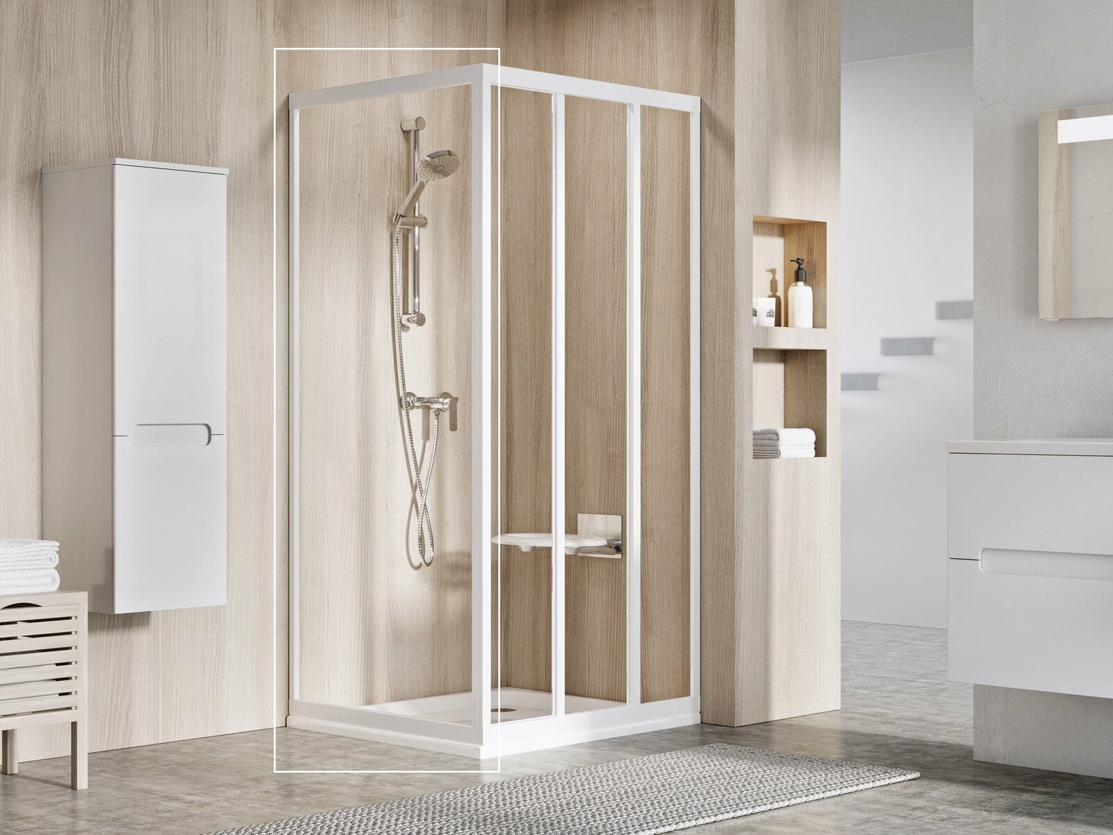 Rohový sprchový kout Supernova v bílém provedení a s výplní z čirého skla s ochrannou vrstvou Ravak AntiCalc®. Posuvný systém otevírání. Výrobek je složen ze sprchových dveří a pevné stěny.