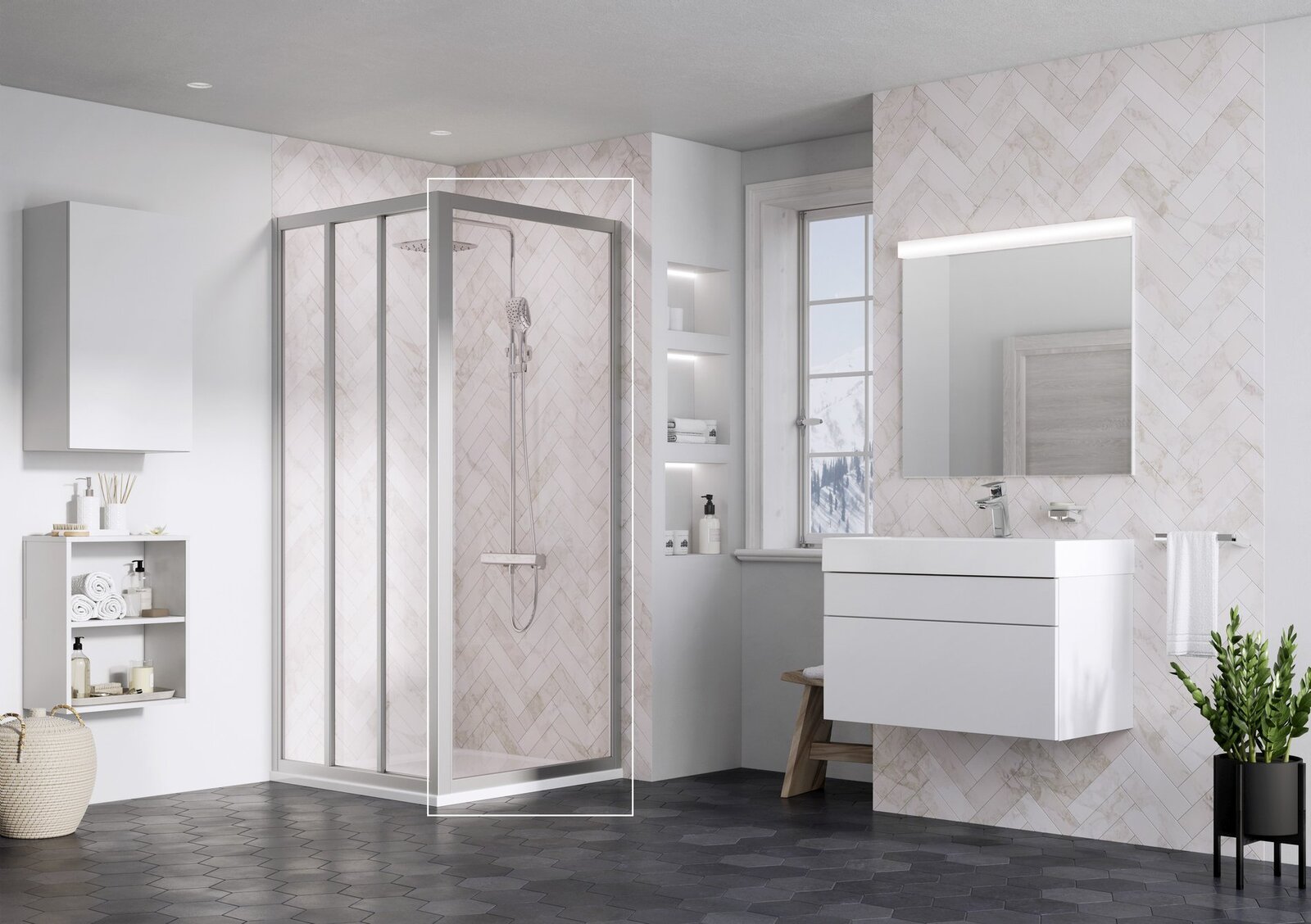 Rohový sprchový kout Supernova v provedení matný chrom a s výplní z čirého skla s ochrannou vrstvou Ravak AntiCalc®. Posuvný systém otevírání. Výrobek je složen ze sprchových dveří a pevné stěny.
