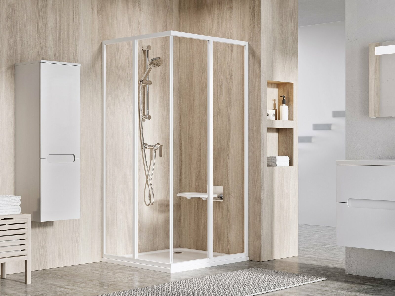 Rohový sprchový kout Supernova v bílém provedení a s výplní z čirého skla s ochrannou vrstvou Ravak AntiCalc®. Posuvný systém otevírání.- rozměr: 80x80 cm
