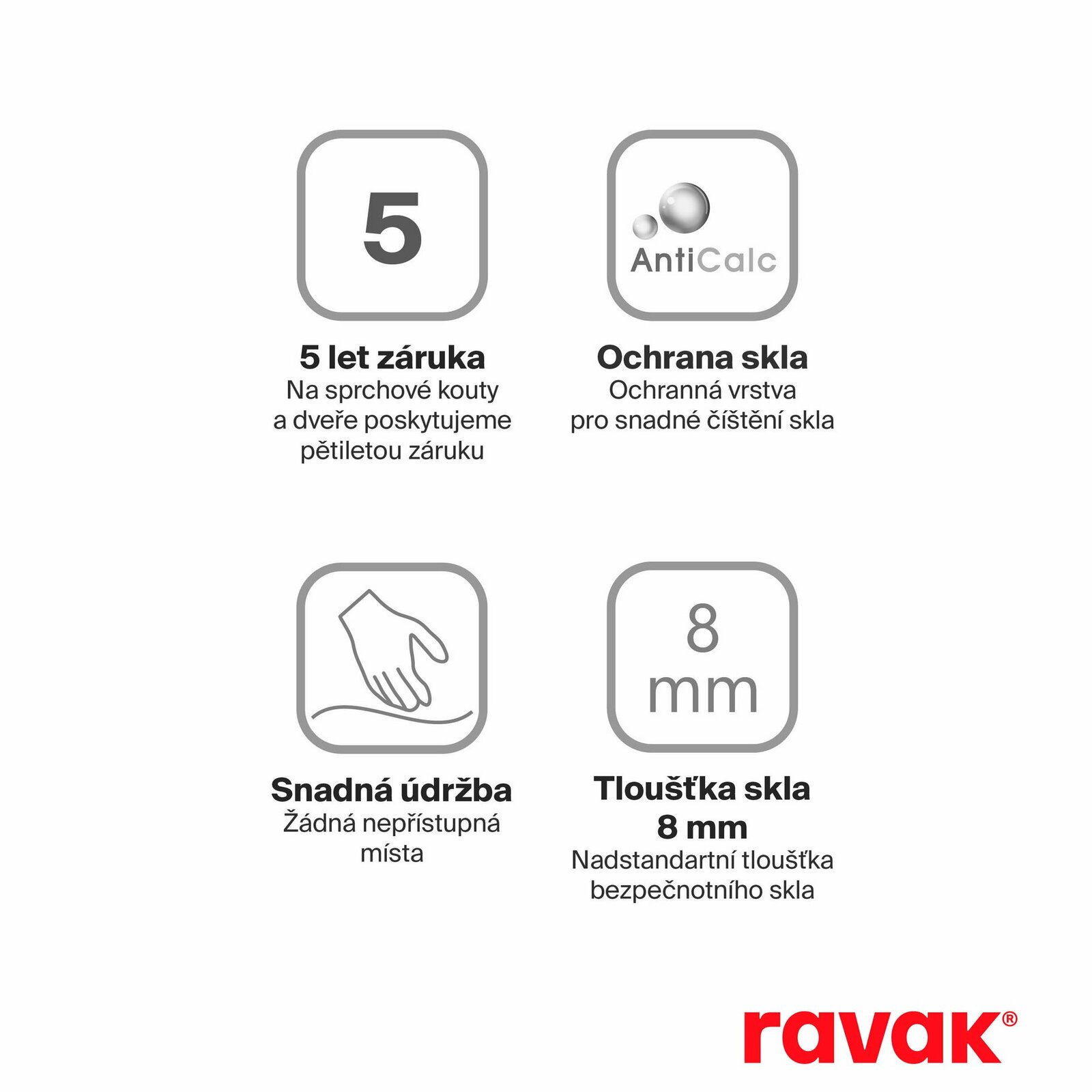 - výplň z bezpečnostního skla: 8 mm; Transparent s ochranou skla Ravak AntiCalc®