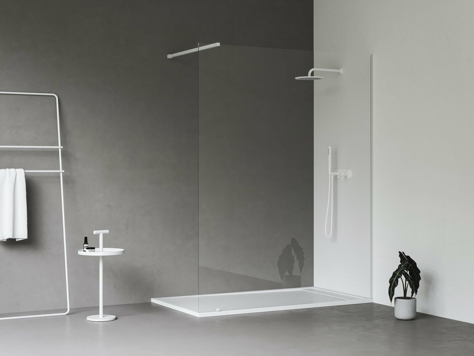 Sprchový kout Walk-In Wall tvoří tvrzené bezpečnostní sklo o tloušťce 8 mm. Stabilitu výrobku zajišťuje kovová vzpěra, která určuje šířku otevřeného vstupu.