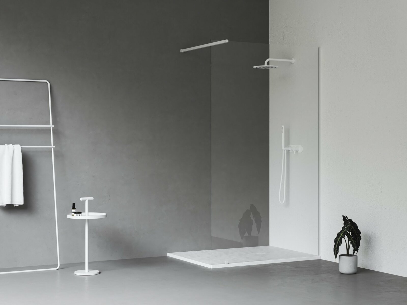 Sprchový kout Walk-In Wall tvoří tvrzené bezpečnostní sklo o tloušťce 8 mm. Stabilitu výrobku zajišťuje kovová vzpěra, která určuje šířku otevřeného vstupu.