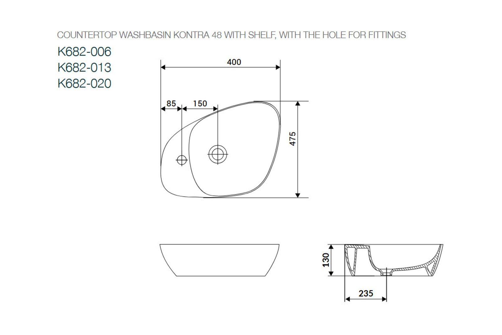 Umyvadlo Cersanit Kontra 48 na desku bílé nepravidelné s odkládacím prostorem s otvorem pro baterii, K682-006