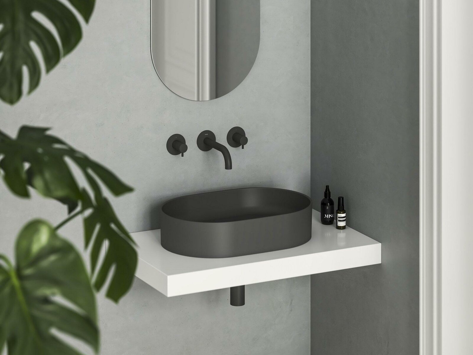 Tenkostěnné keramické umyvadlo Ceramic Slim O k instalaci na desku nebo skříňku, bez přepadu. Antracit provedení.- rozměry (šxhxv): 55 x 37 x 12 cm