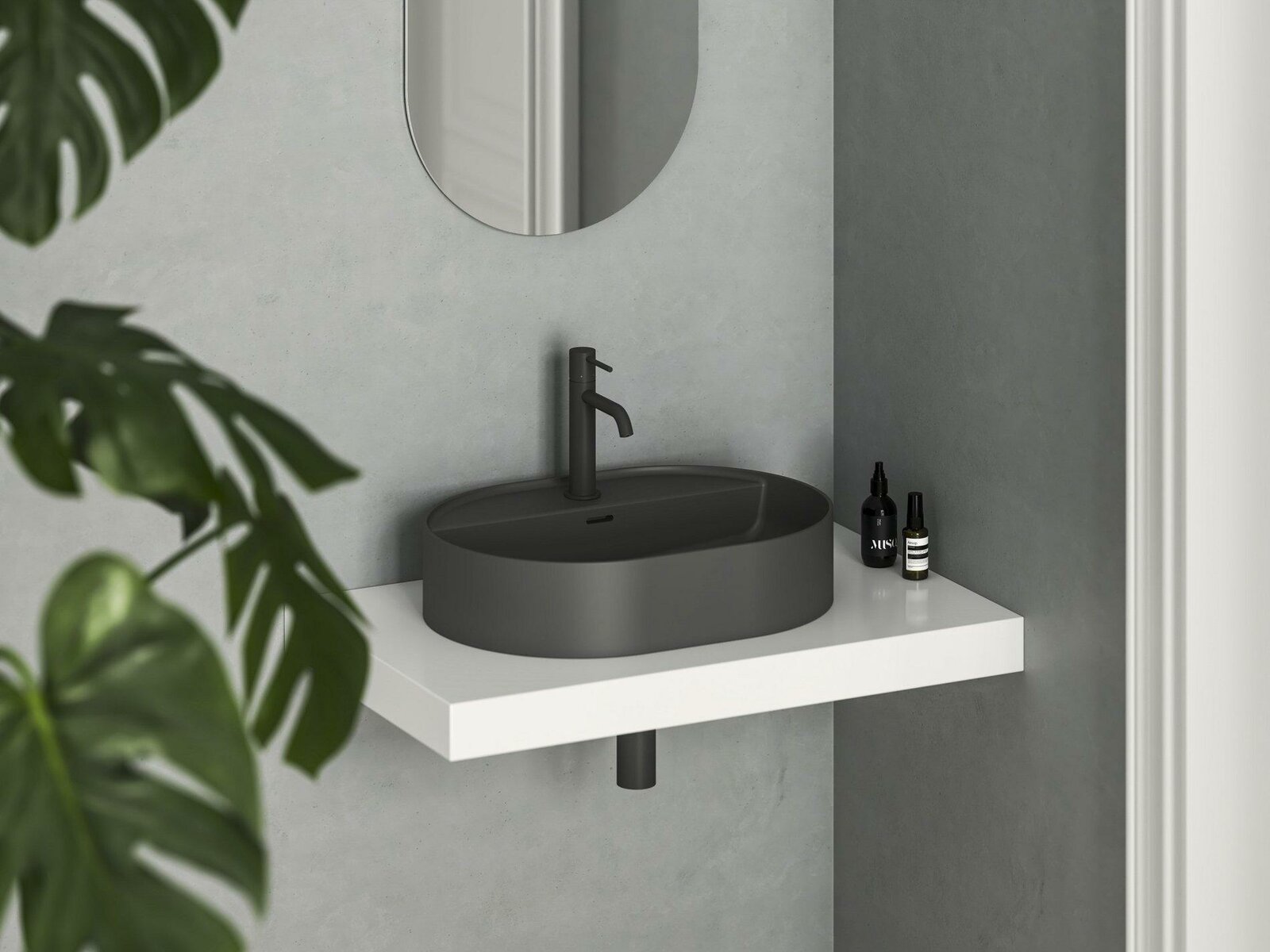 Tenkostěnné keramické umyvadlo Ceramic Slim Shelf O k instalaci na desku nebo skříňku, s přepadem. Antracit provedení.- rozměry (šxhxv): 55 x 40 x 12 cm