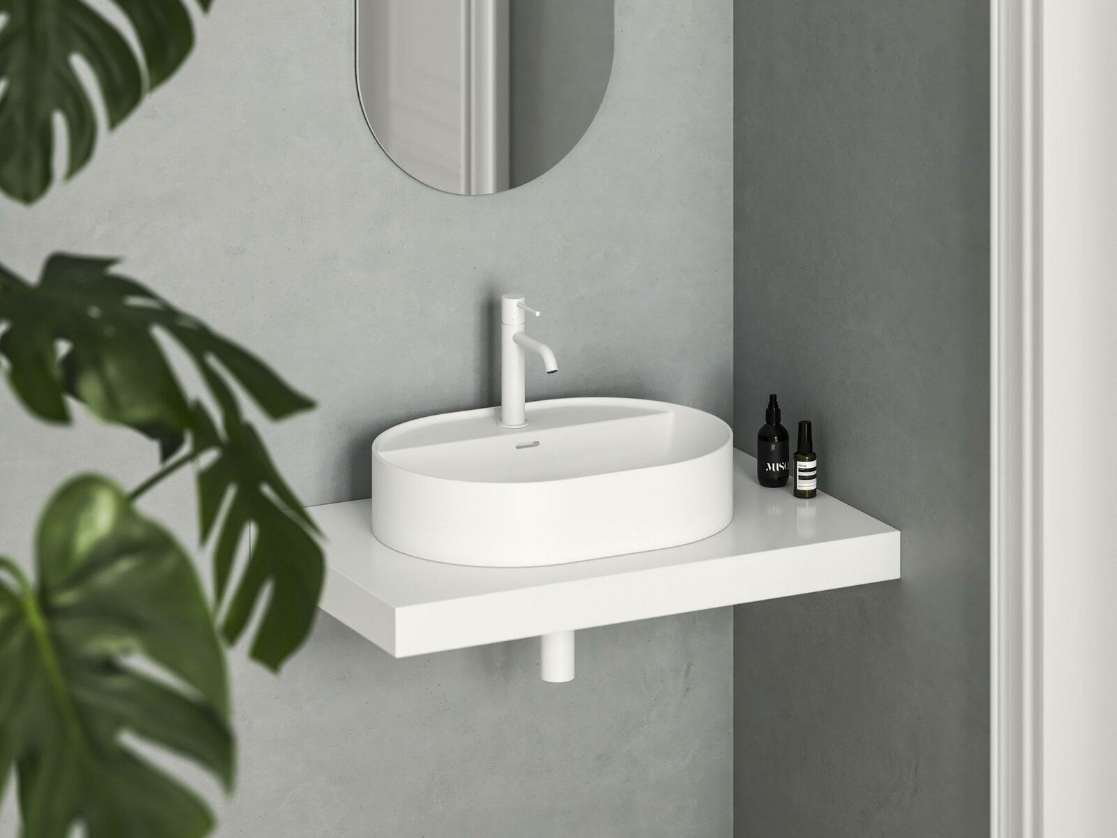 Tenkostěnné keramické umyvadlo Ceramic Slim Shelf O k instalaci na desku nebo skříňku, s přepadem. Bílé matné provedení.- rozměry (šxhxv): 55 x 40 x 12 cm