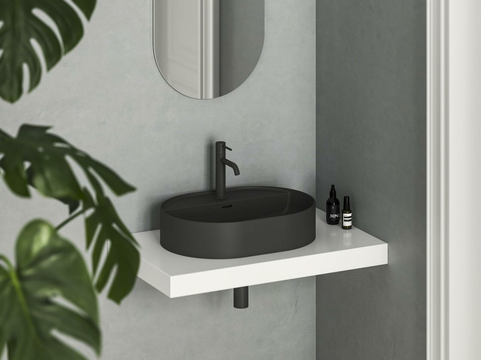 Tenkostěnné keramické umyvadlo Ceramic Slim Shelf O k instalaci na desku nebo skříňku, s přepadem. Černé matné provedení.- rozměry (šxhxv): 55 x 40 x 12 cm
