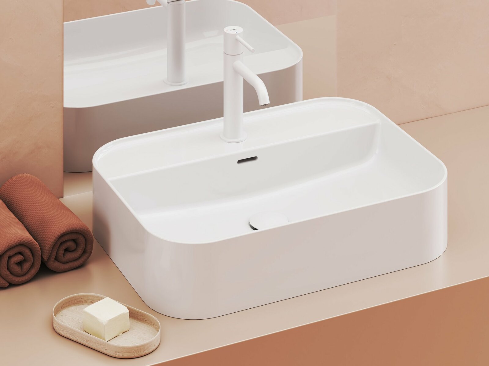Tenkostěnné keramické umyvadlo Ceramic Slim k instalaci na desku nebo skříňku, s přepadem. Bílé provedení.- rozměry (šxhxv): 55 x 40 x 12 cm
