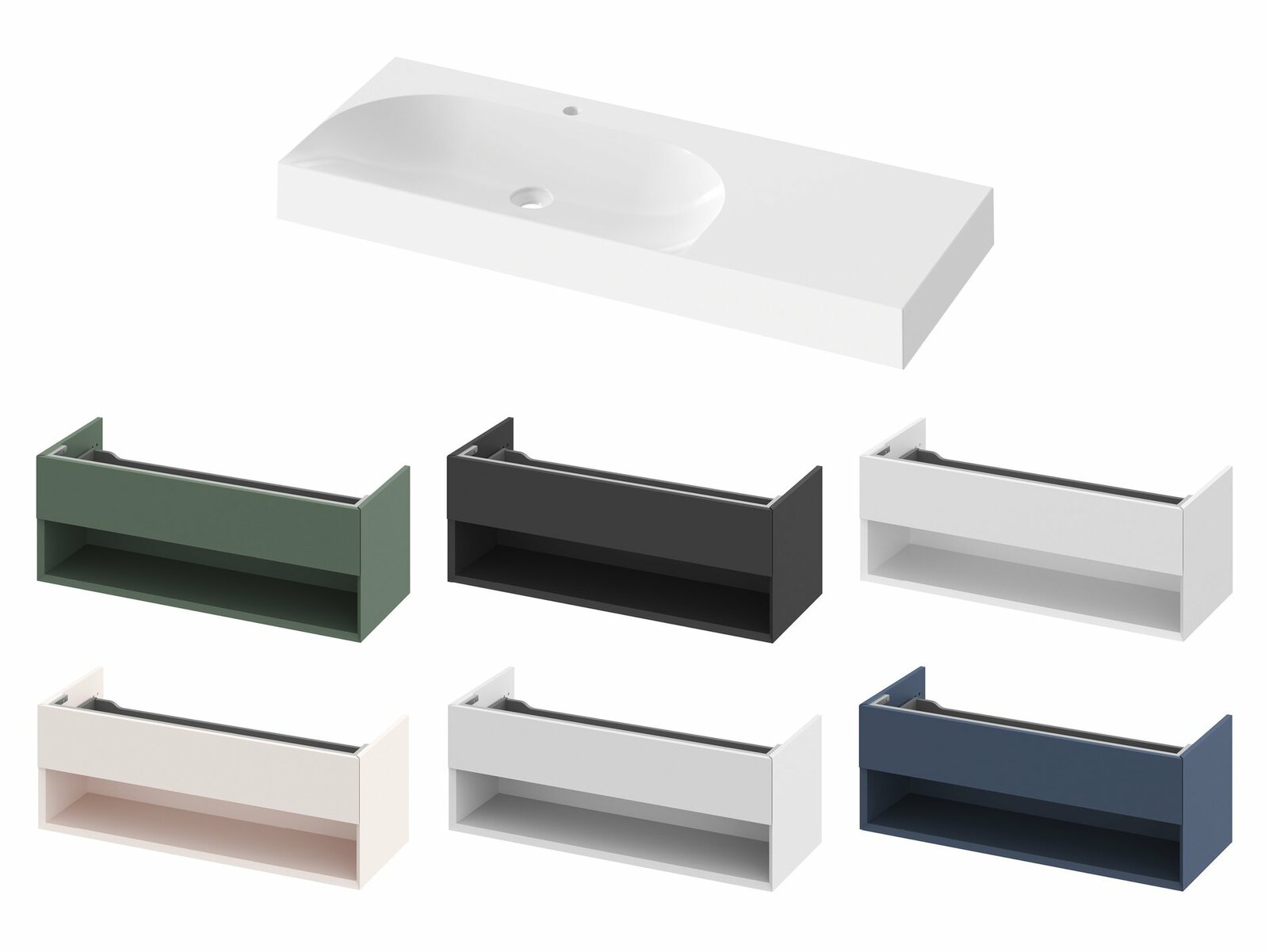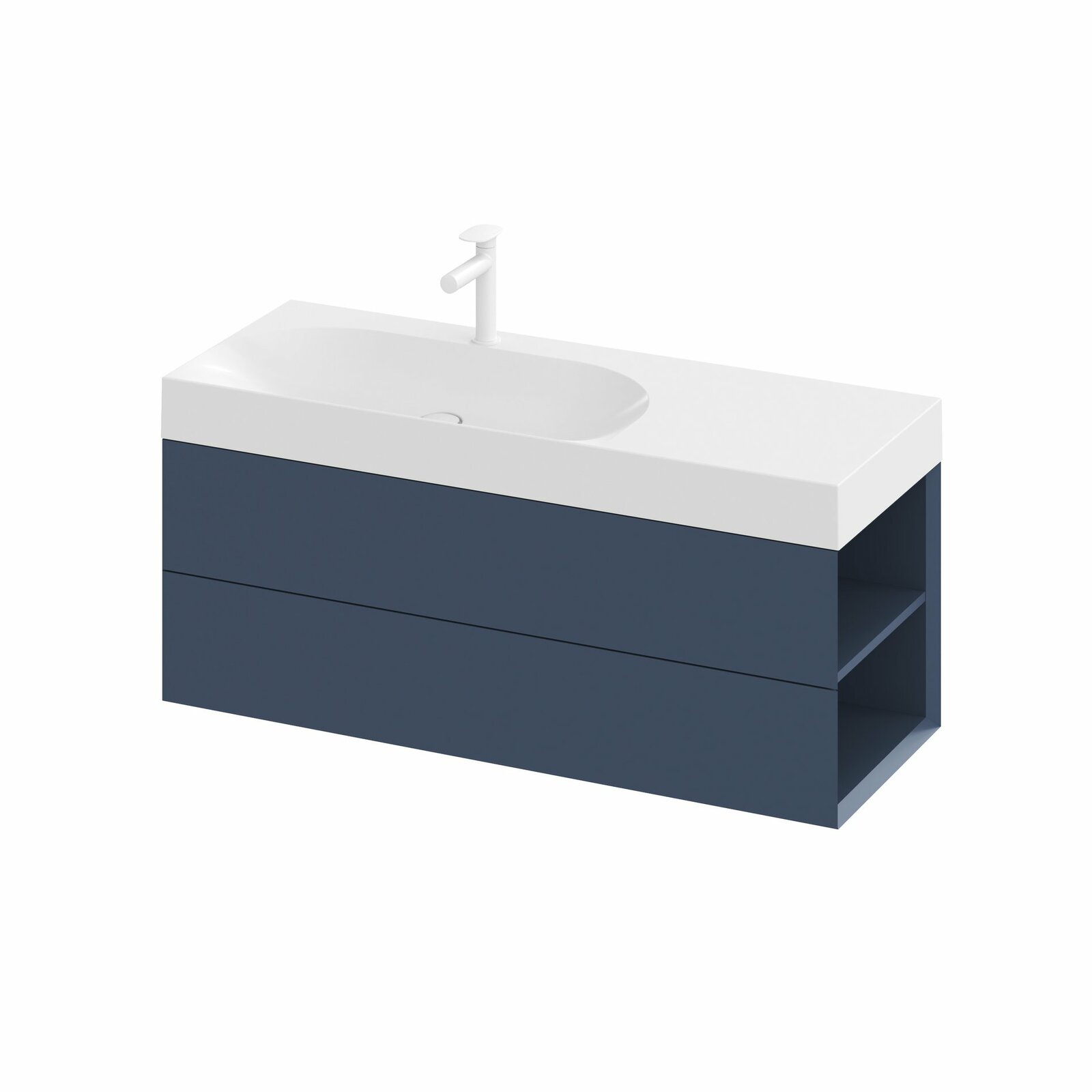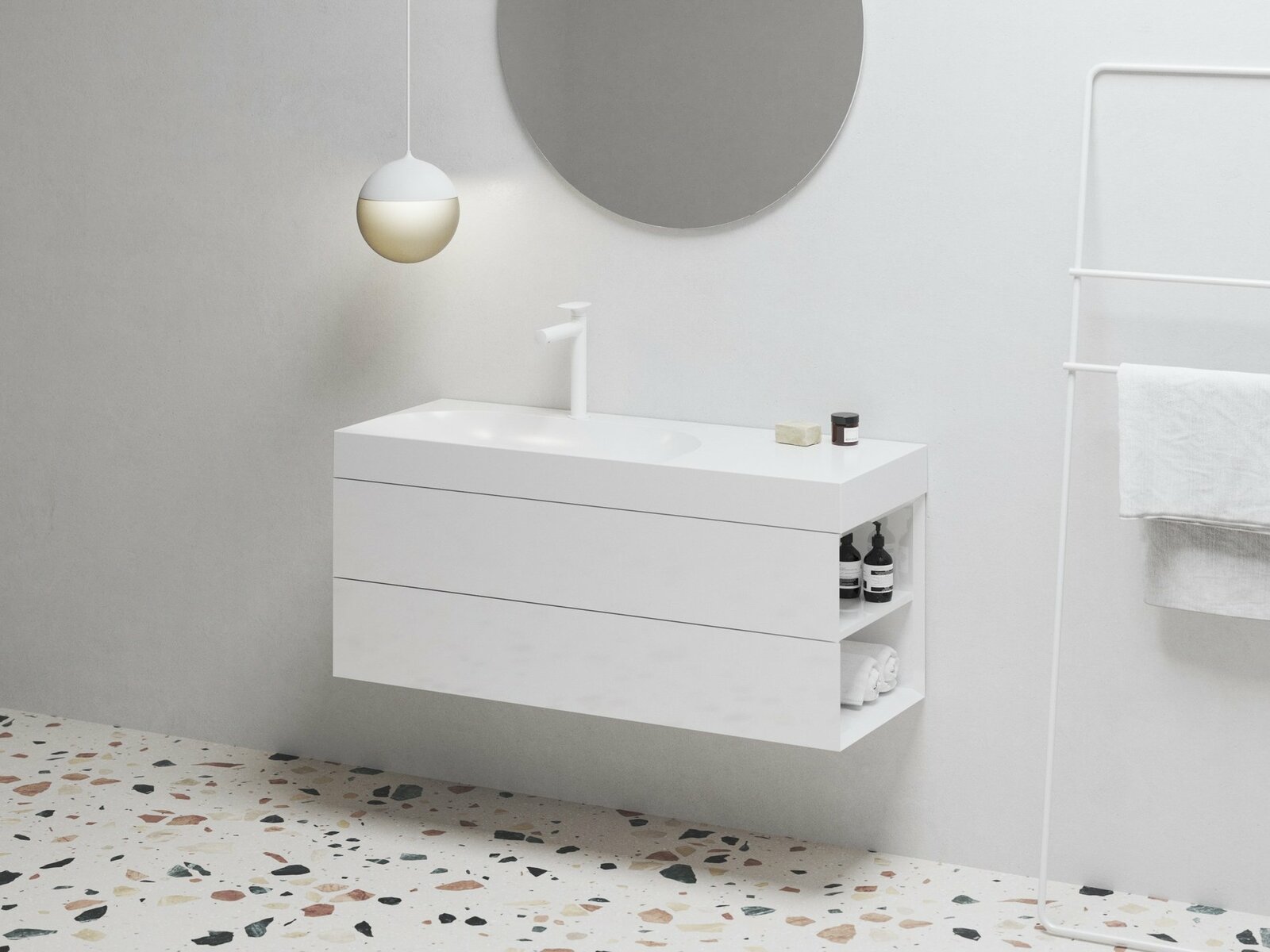 Nábytkové umyvadlo Lite z litého mramoru k instalaci na zeď nebo k zapuštění do závěsné skříňky, bez přepadu. Bílé provedení. Pravá varianta. S otvorem pro umyvadlovou baterii.- rozměry (šxhxv): 120 x 45 x 10 cm