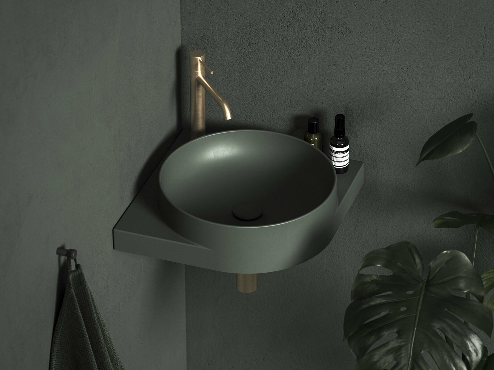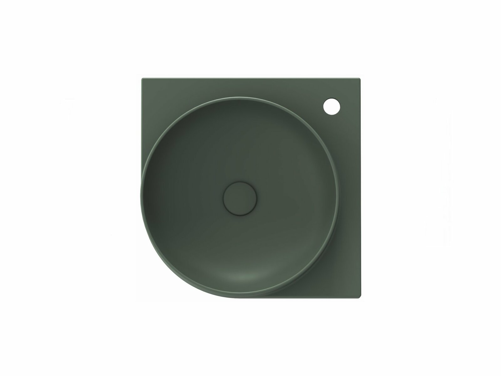 Tenkostěnné keramické rohové umyvadlo Yard k instalaci na konzoli Yard, bez přepadu. V provedení Grey Green. S otvorem pro stojánkovou baterii.- rozměry (šxhxv): 45 x 45 x 12,5 cm