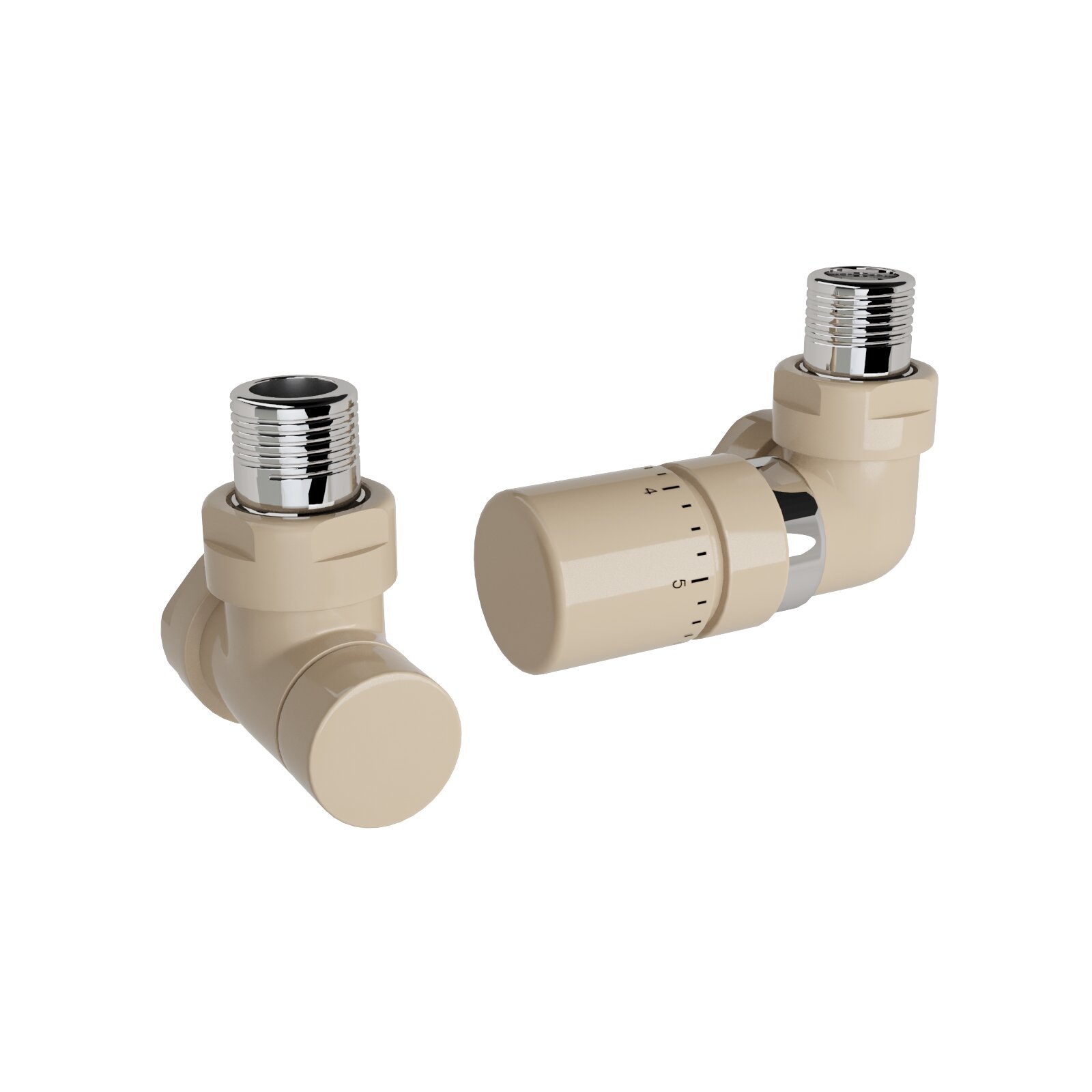 Ventil Zehnder úhlový rohový, rohové šroubení pro zpátečku 1/2", s termostatickou hlavicí Design Line, Set G, RAL 0523 beige quartz, Z-839739-0523