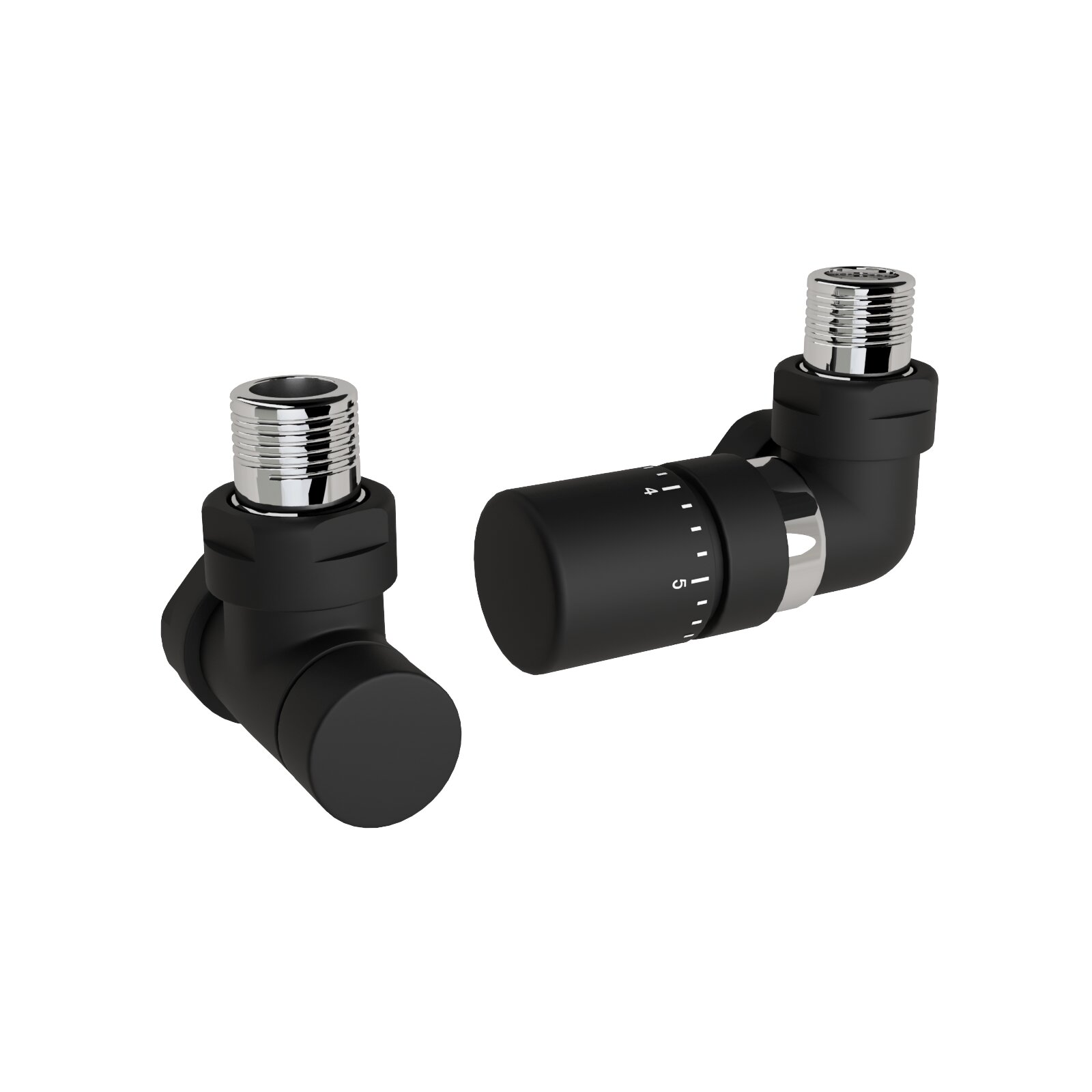 Ventil Zehnder úhlový rohový, rohové šroubení pro zpátečku 1/2", s termostatickou hlavicí Design Line, Set G, RAL 0557 black matt, Z-839739-0557