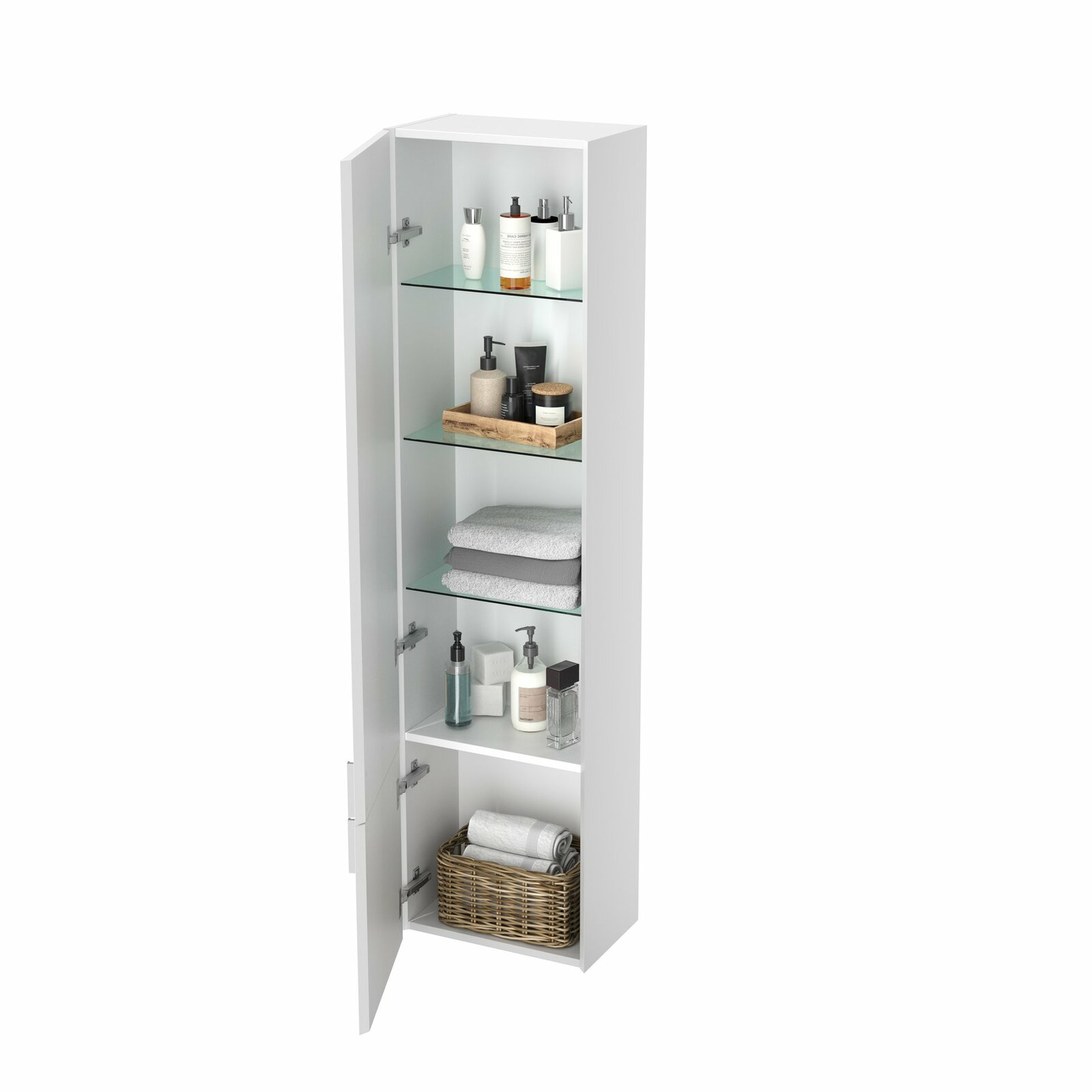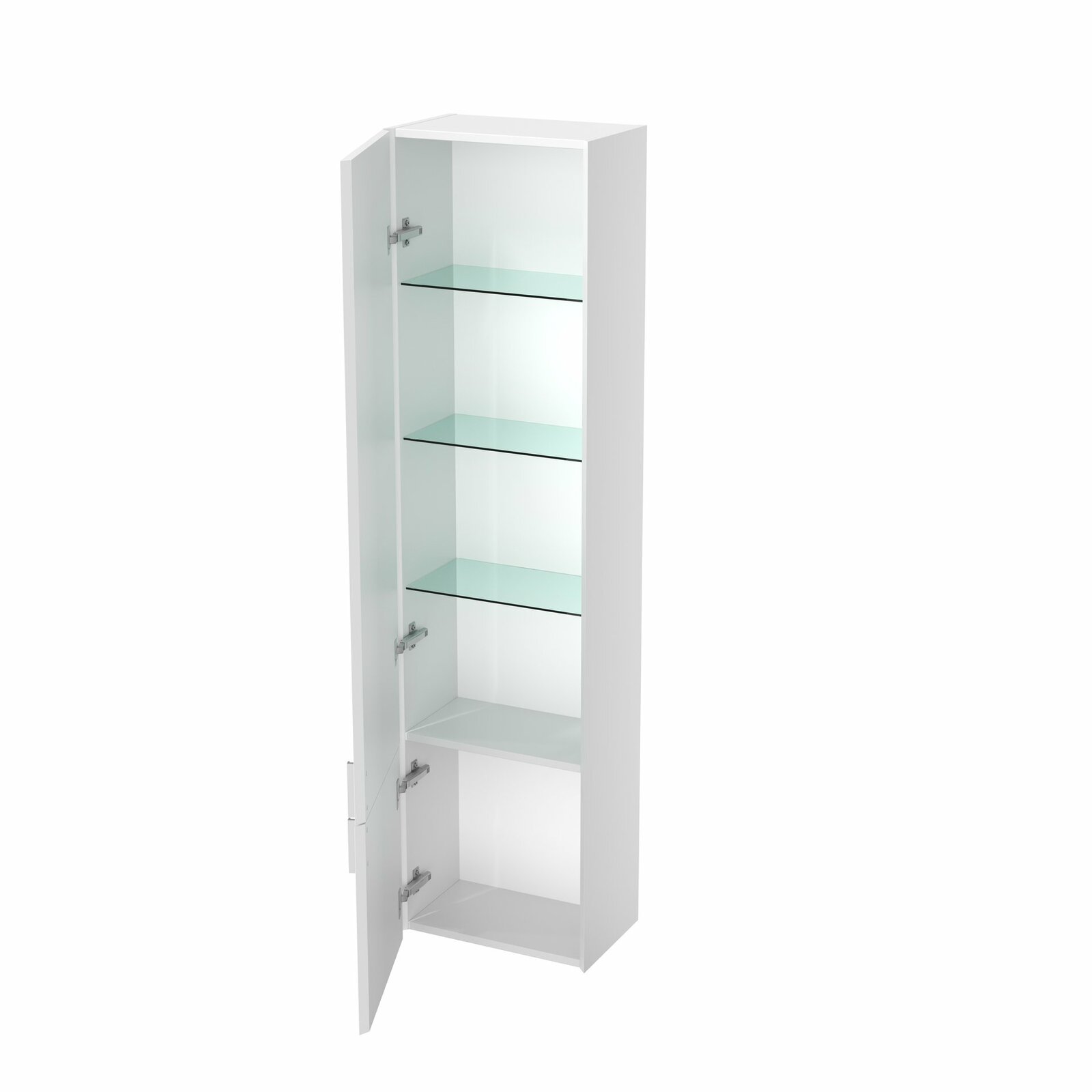 Vysoká skříňka Clear II se třemi skleněnými poličkami v horní části. Dvířka jsou opatřeny tlumiči dovírání. Příslušná varianta levá/pravá je dána stranou, na které jsou panty. Dodáváno ve smontovaném stavu. Vysoká skříňka je montována na zeď.