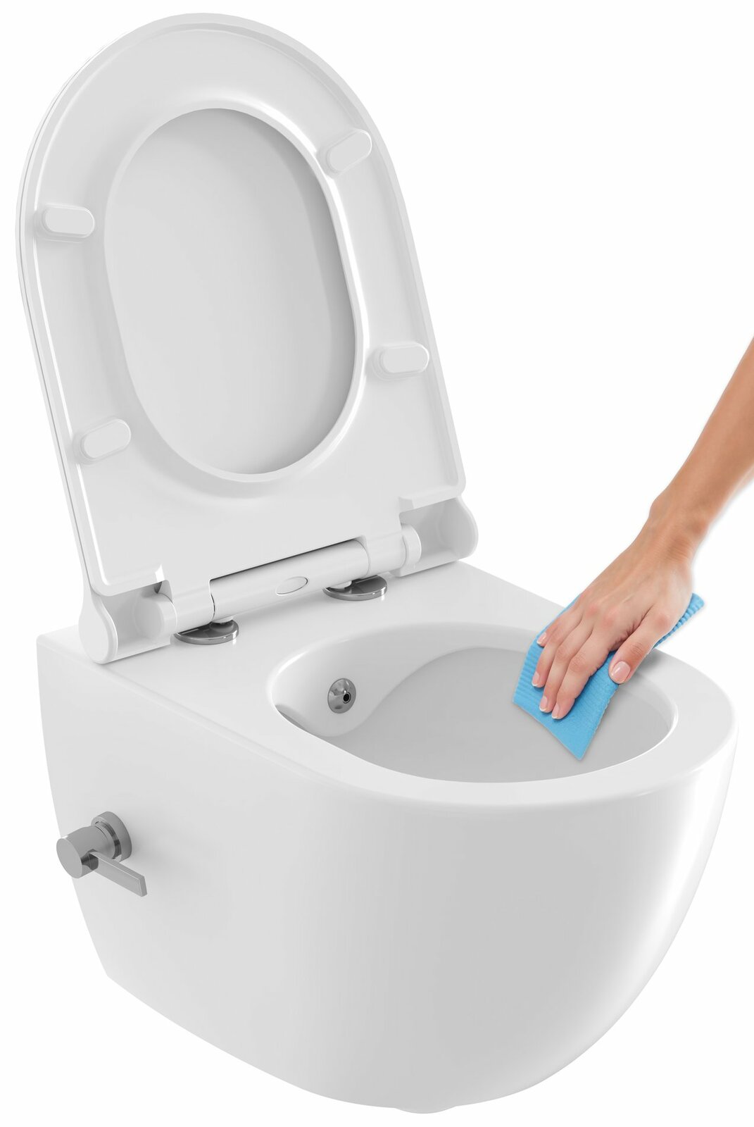 Ani na vnějšku toaletní mísy nejsou žádná špatně přístupná místa, čímž se minimalizuje možnost usazování nečistot a bakterií. Závěsný systém bidetovací toalety pak usnadňuje úklid podlahy pod ní.